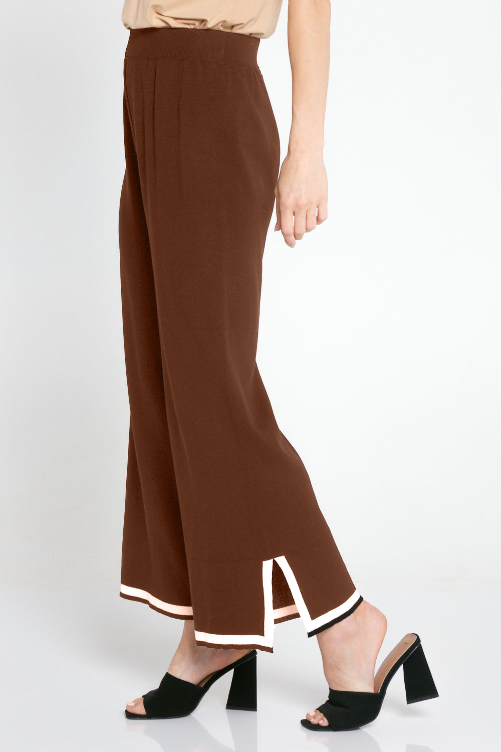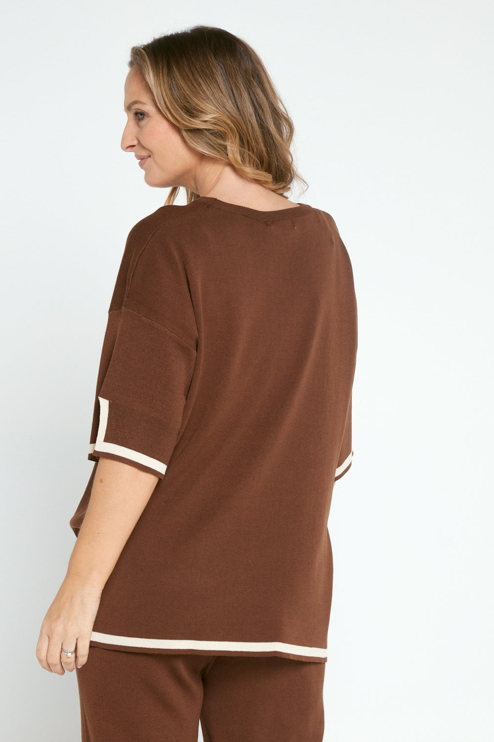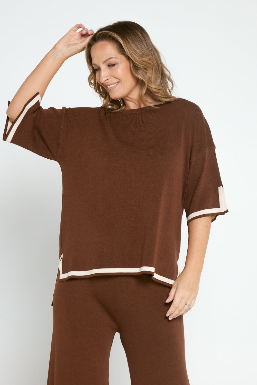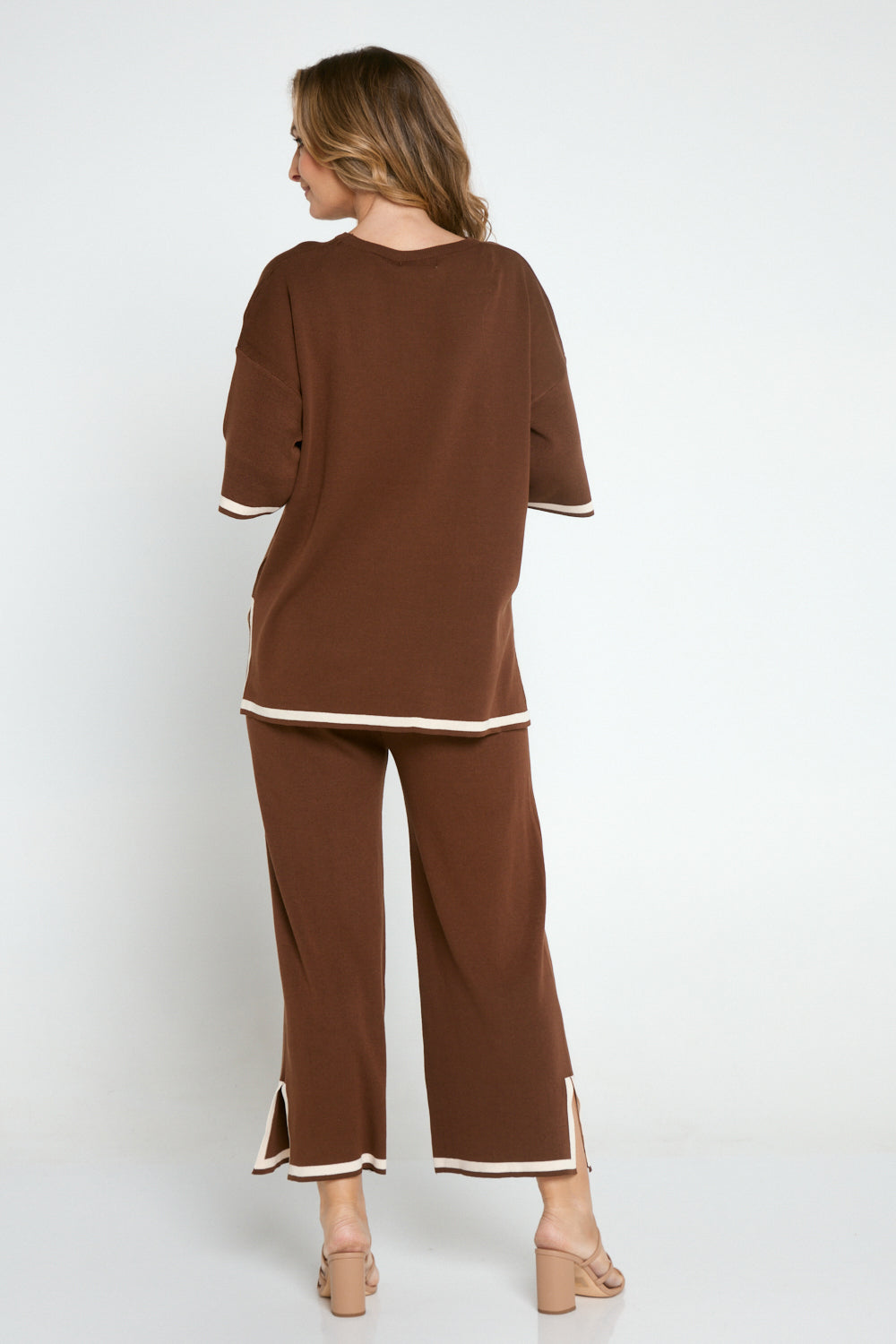Elevate your wardrobe with our Regina Knit Top and Pant Set in chocolate brown and cream. The lightweight knit offers a relaxed fit and side splits for a modern touch. The top features a ribbed boat neck and drop shoulders, while the pants boast an elasticated waistband and wide legs. Perfect for any occasion, this set is so comfortable, yet exudes elegance and sophistication.