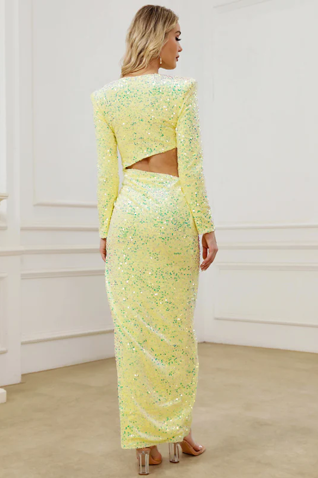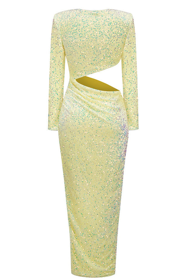 The Ricky Sequins Gown is delightfully decadent and easily stands out in a crowd. whipped up from stretchy fabric with a boat neck-line and long sleeves. A thigh-high slit for added drama compliments the sequin embellished piece. Accessorise with sparkling jewellery and slip on a strappy heel.