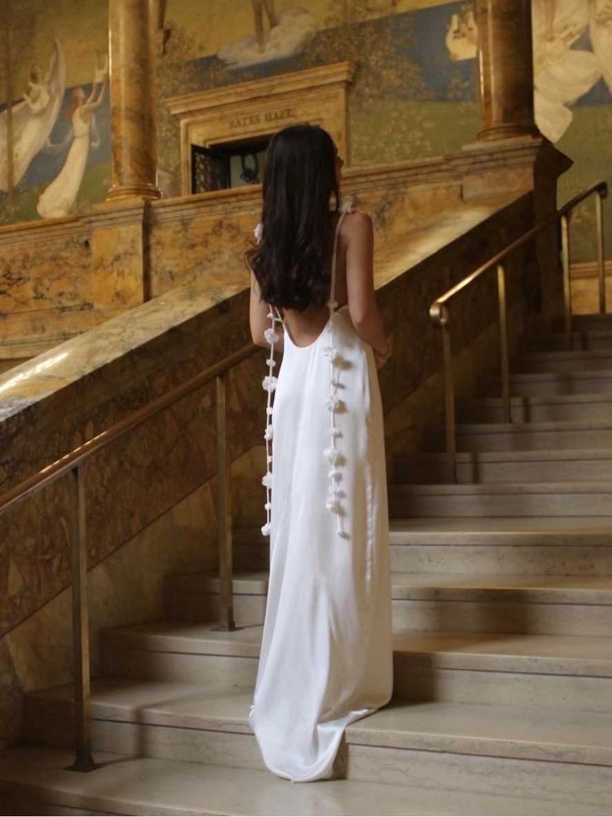 - Stunning 3D floral detail on the shoulder strap creates a dramatic and romantic look