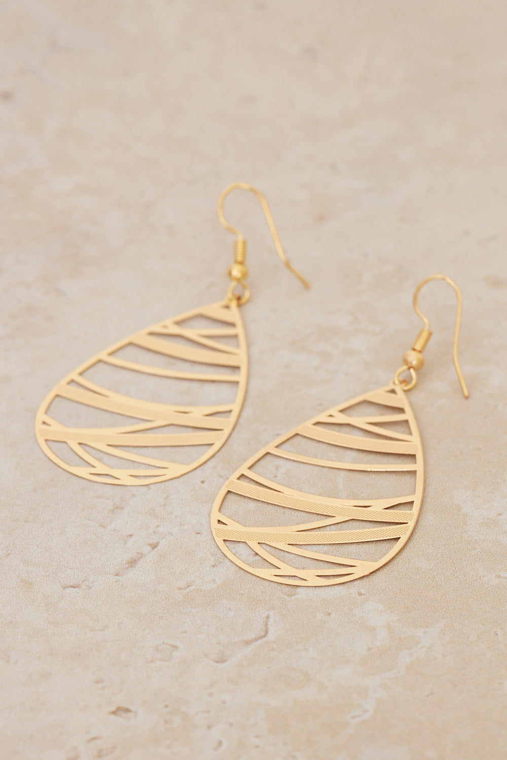 The Sienna Teardrop Earrings in gold tone showcase a sleek teardrop shape with modern cut-out detailing. Their lightweight structure and abstract design bring a contemporary edge to any ensemble, making them a versatile accessory for day or night. Perfect for adding a touch of elegance to your look.