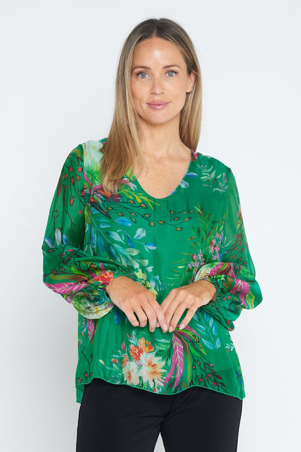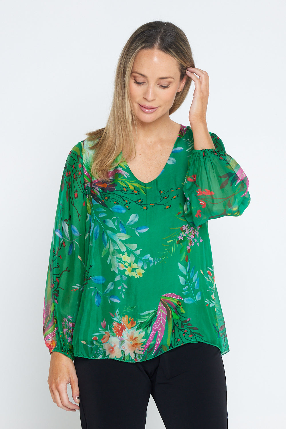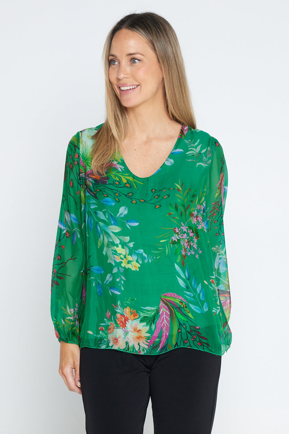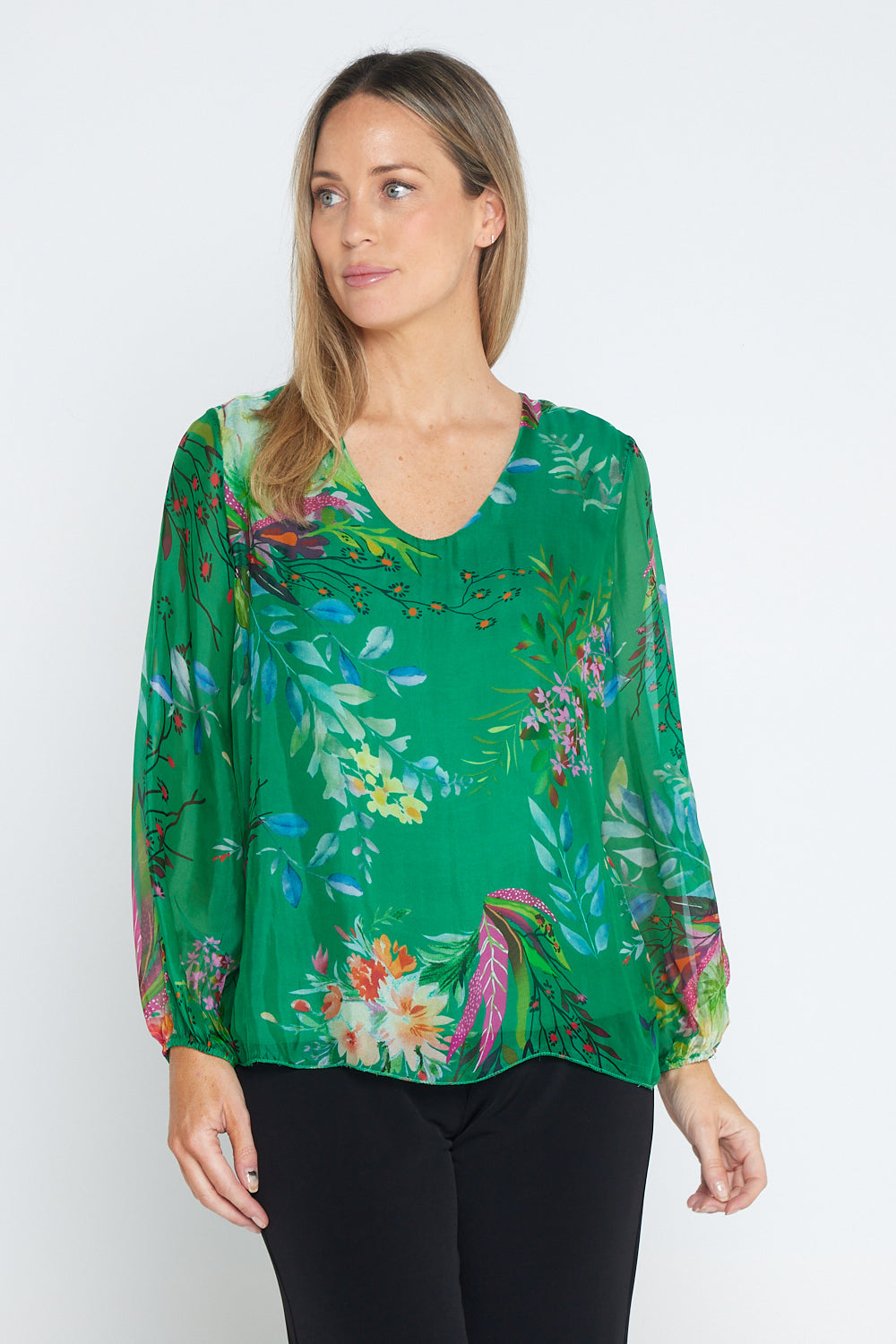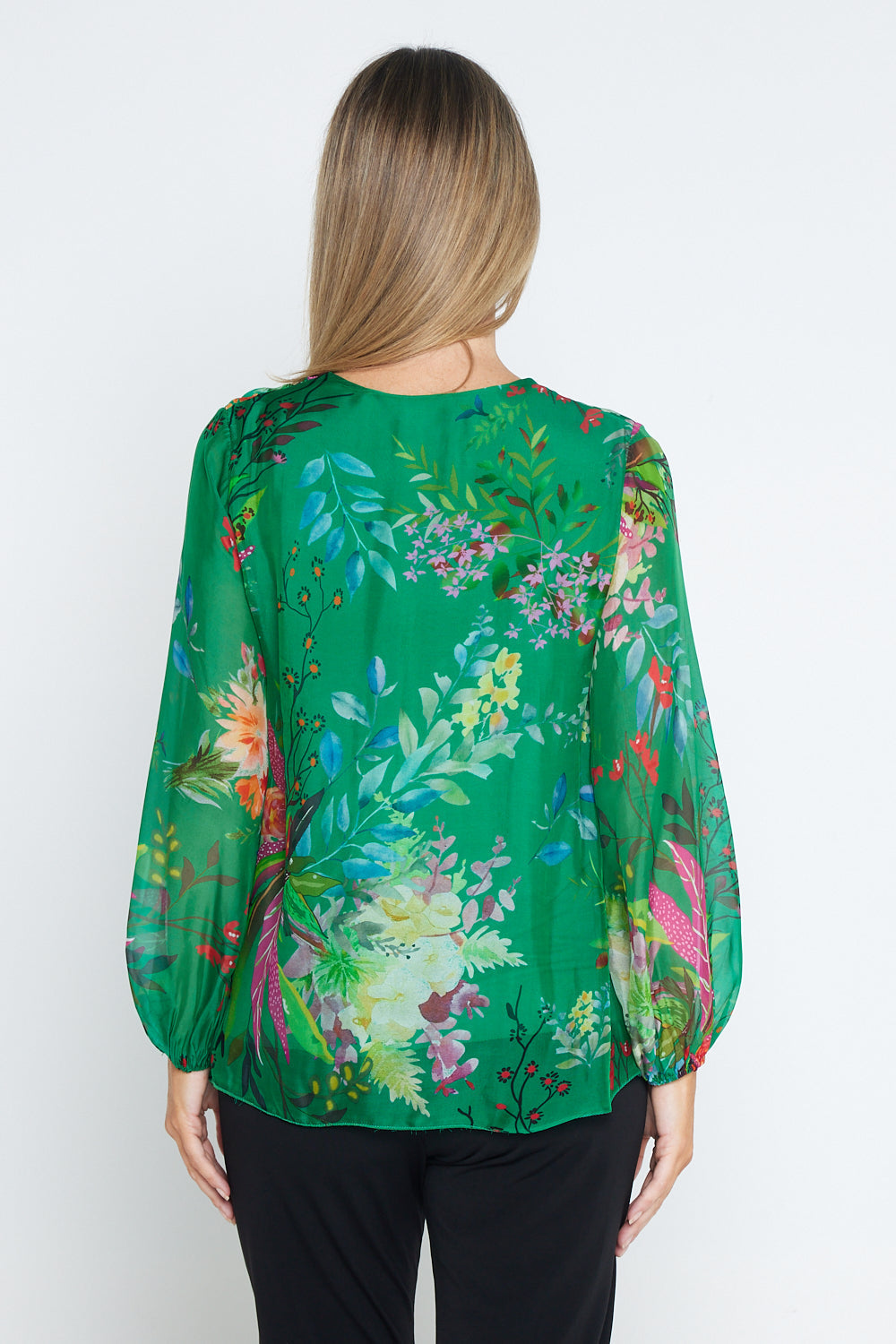 Sierra Long Sleeve Silk Top - Emerald Botanical