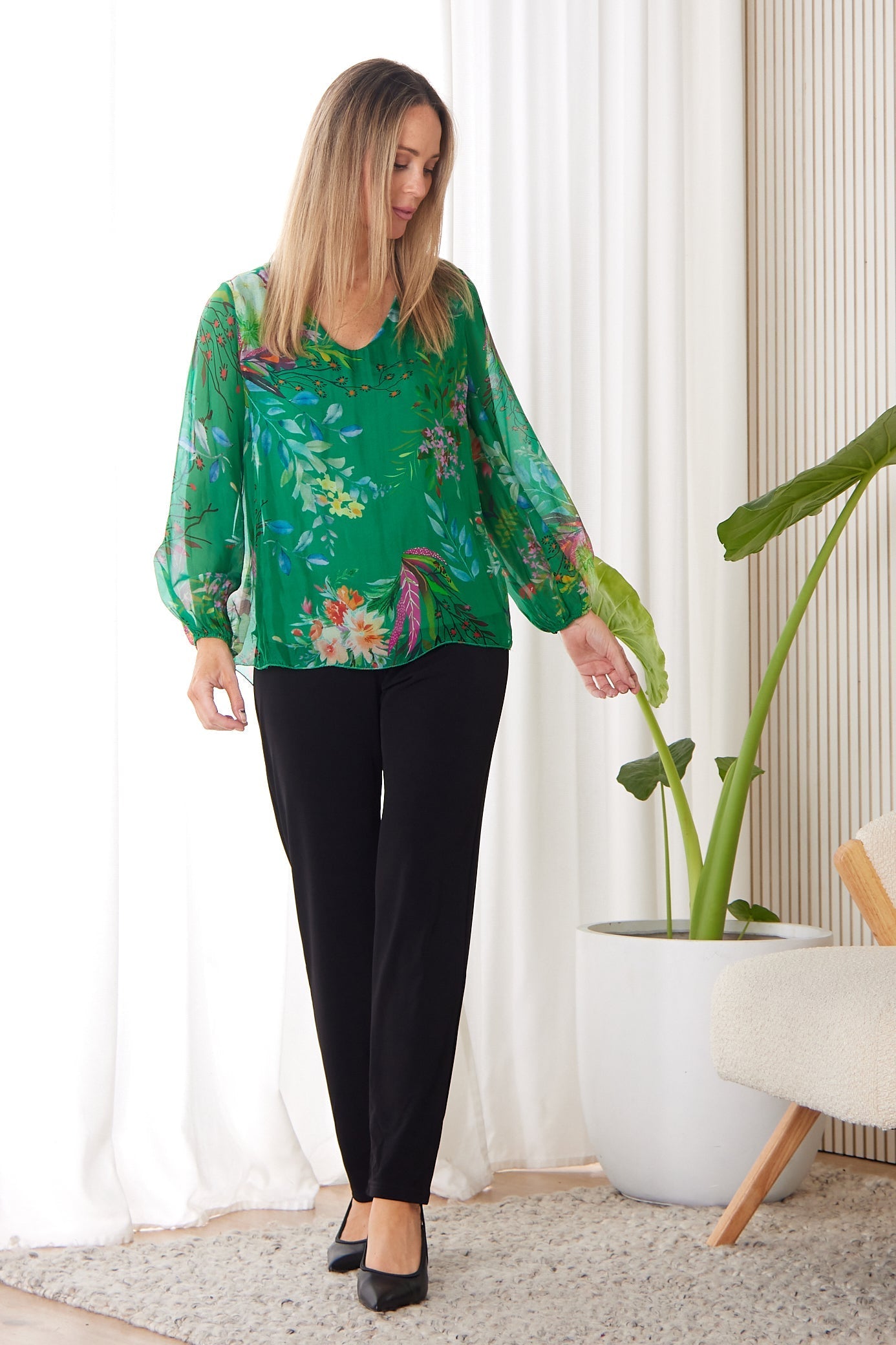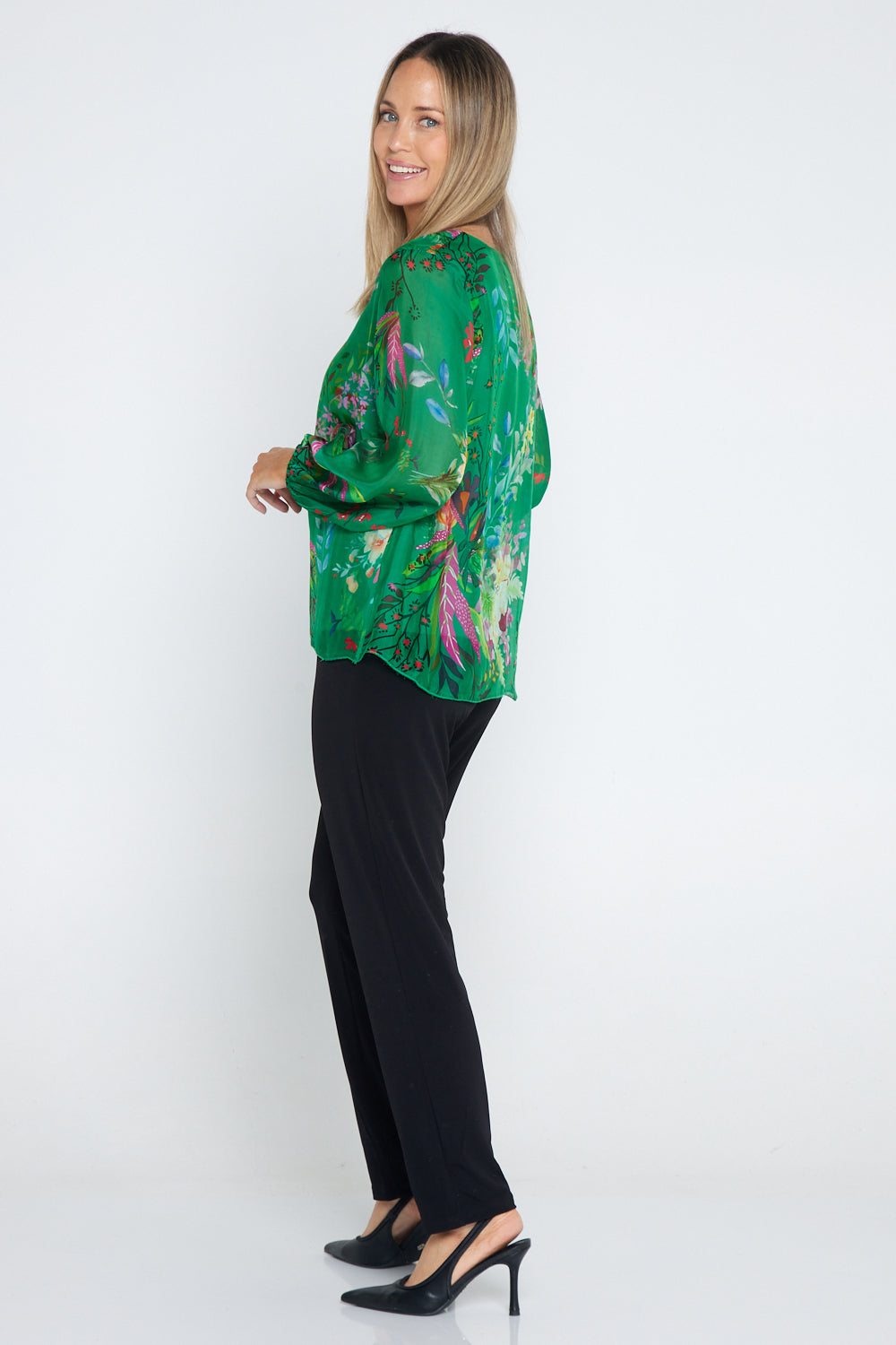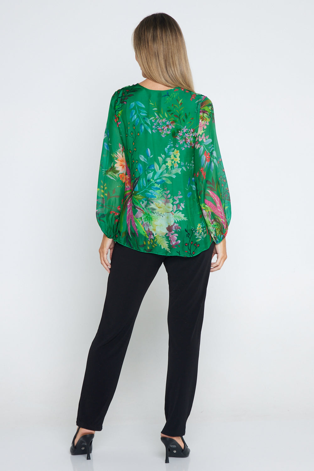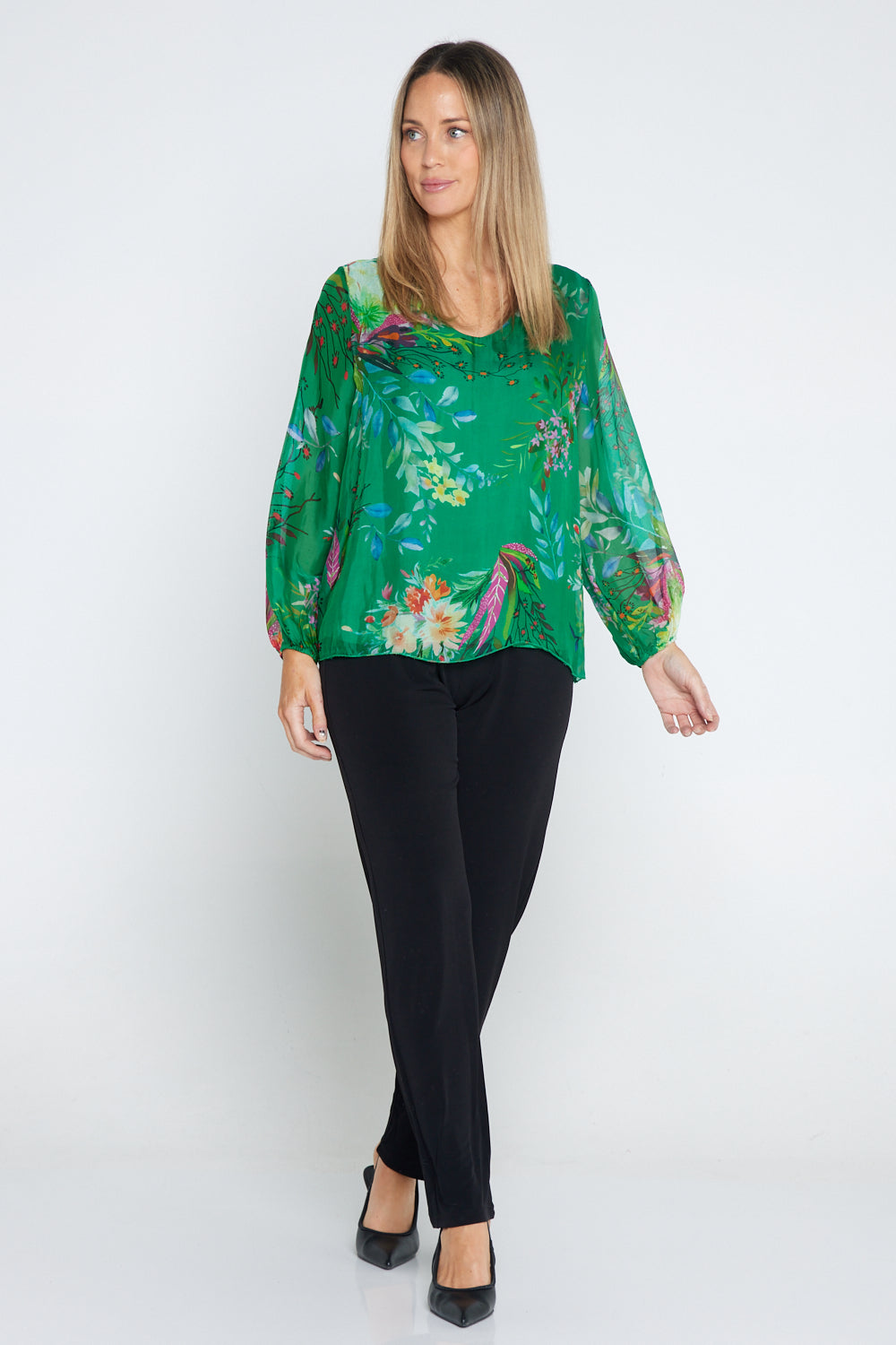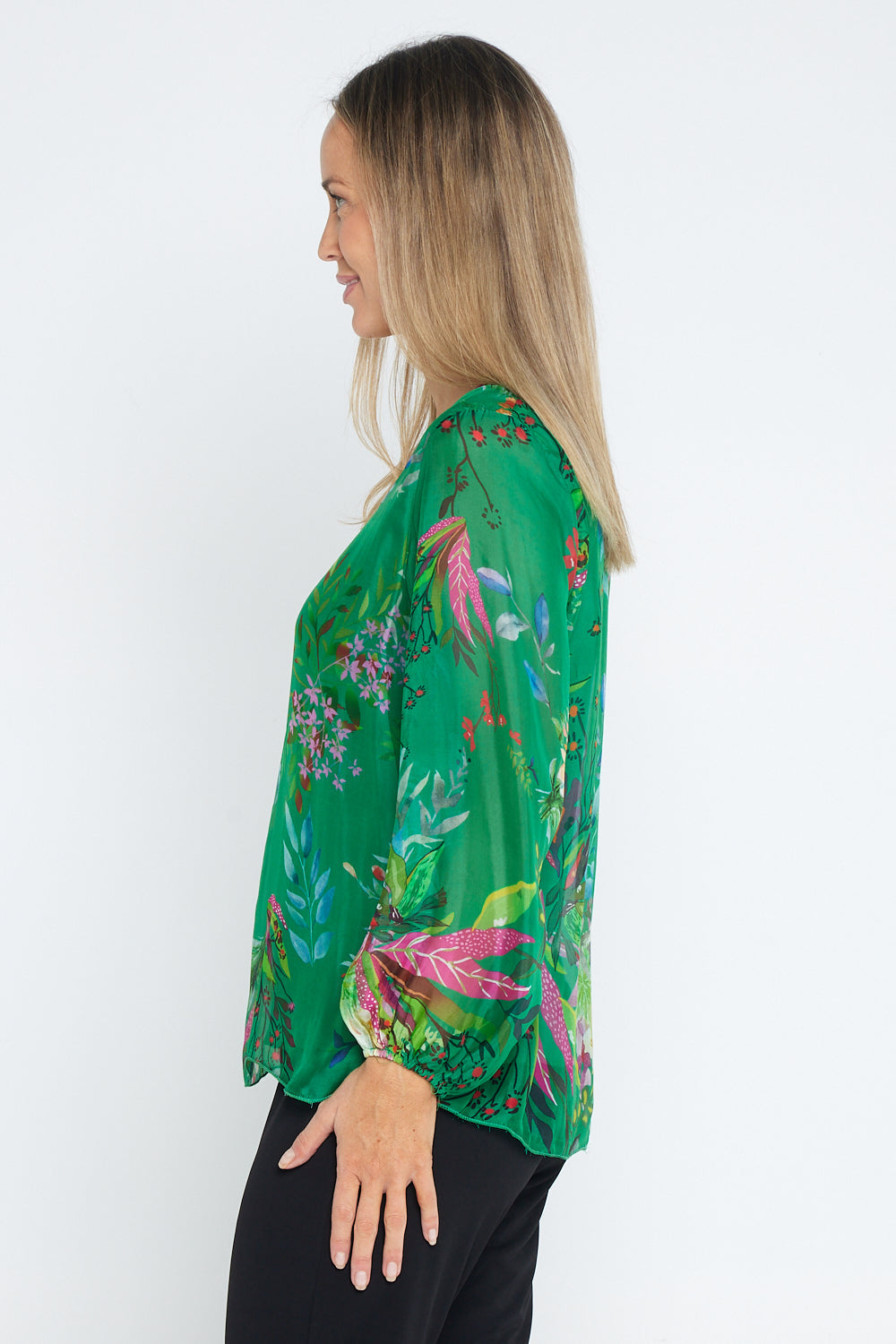 Sierra Long Sleeve Silk Top - Emerald Botanical