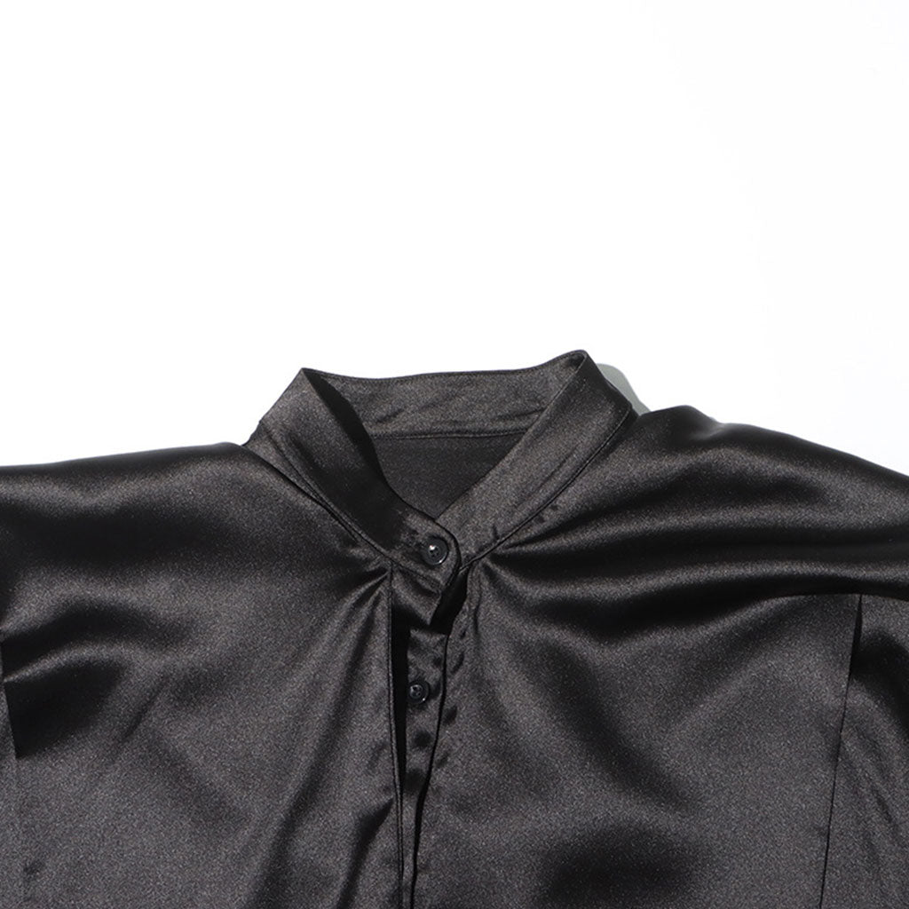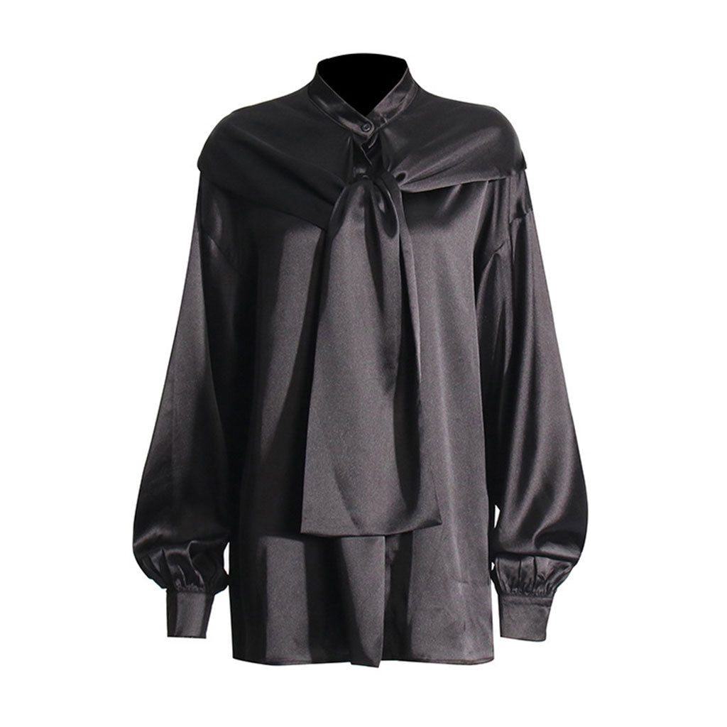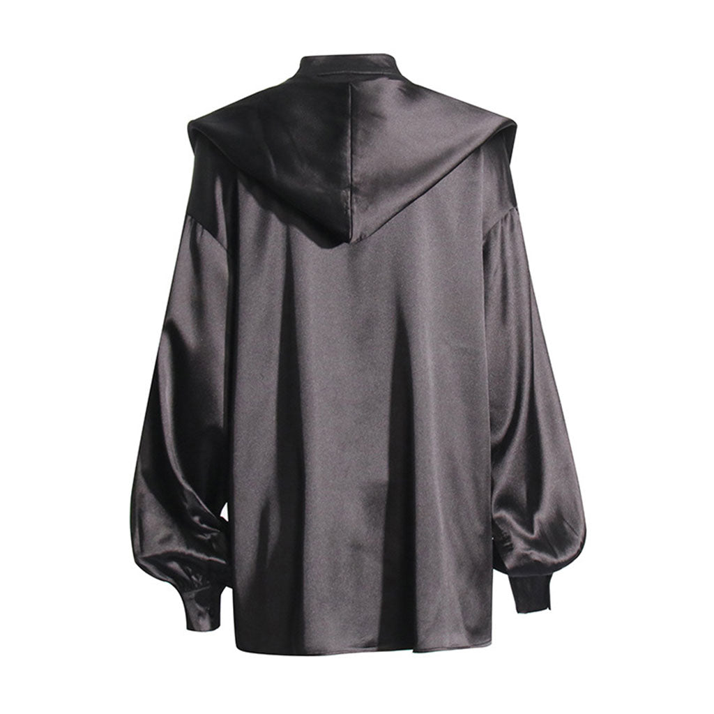 Silky Stand Collar Tie Neck Hooded Lantern Sleeve Oversized Satin Shirt