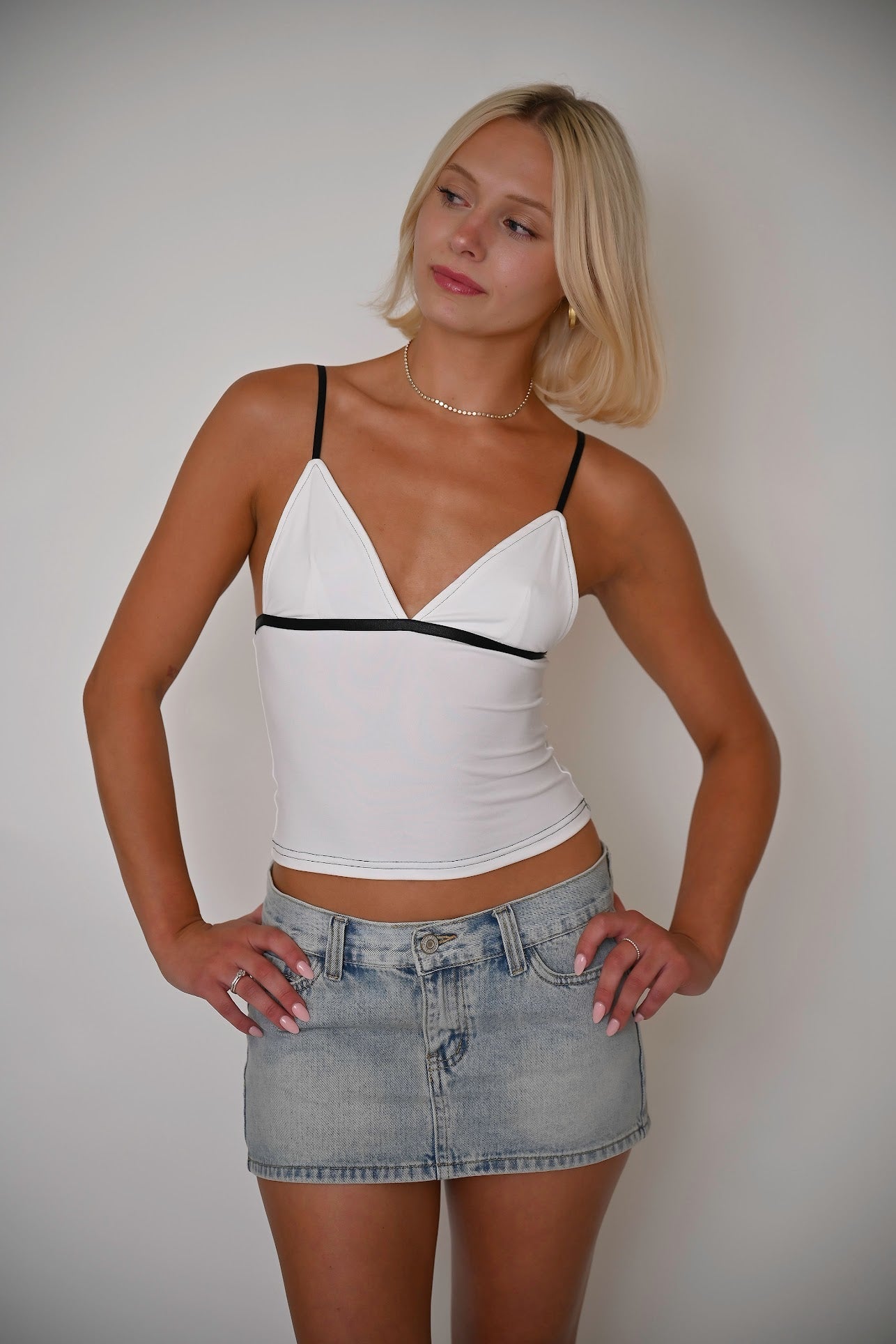Unveil a blend of simplicity and allure with the "Sleek Contour Top." This camisole is the epitome of chic minimalism with its sleek, white fabric and contrasting navy trim. The plunging V-neckline accentuates the décolletage, while the slim spaghetti straps provide delicate support and adjust for a perfect fit. Crafted with a soft, stretch-infused material, it contours gracefully to the body, ending with a snug hem that allows for versatile styling above or below the waistline. An essential piece for layering or standing alone, it's a modern wardrobe staple.