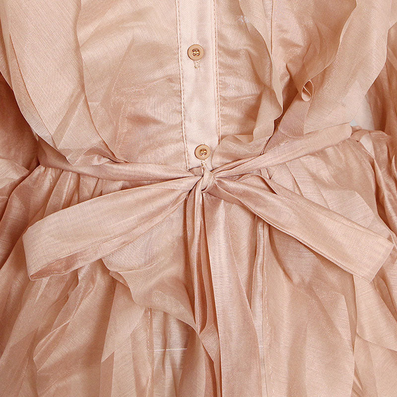 Sophisticated Point Collar Button Front Tie Waist Long Sleeve Layered Ruffle Blouse