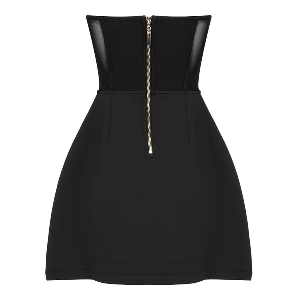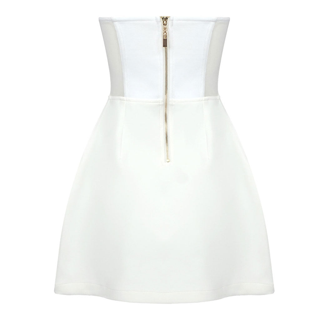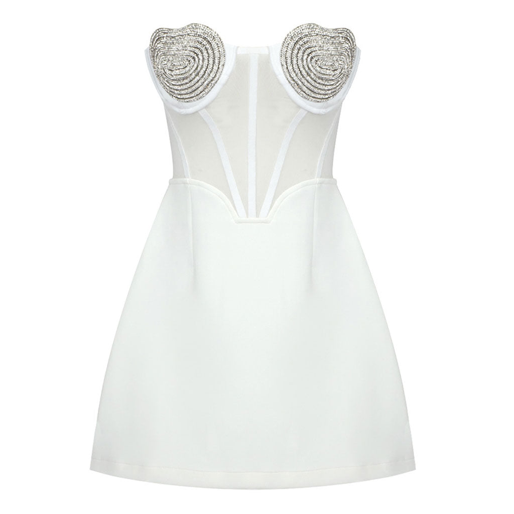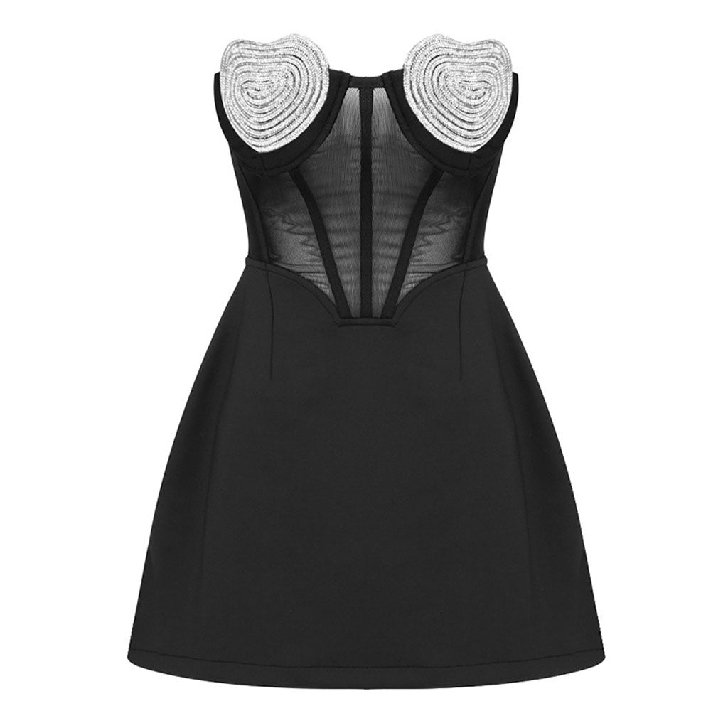 Sparkle Rhinestone Heart Bandeau Neck Sheer Mesh Strapless Mini Party Dress