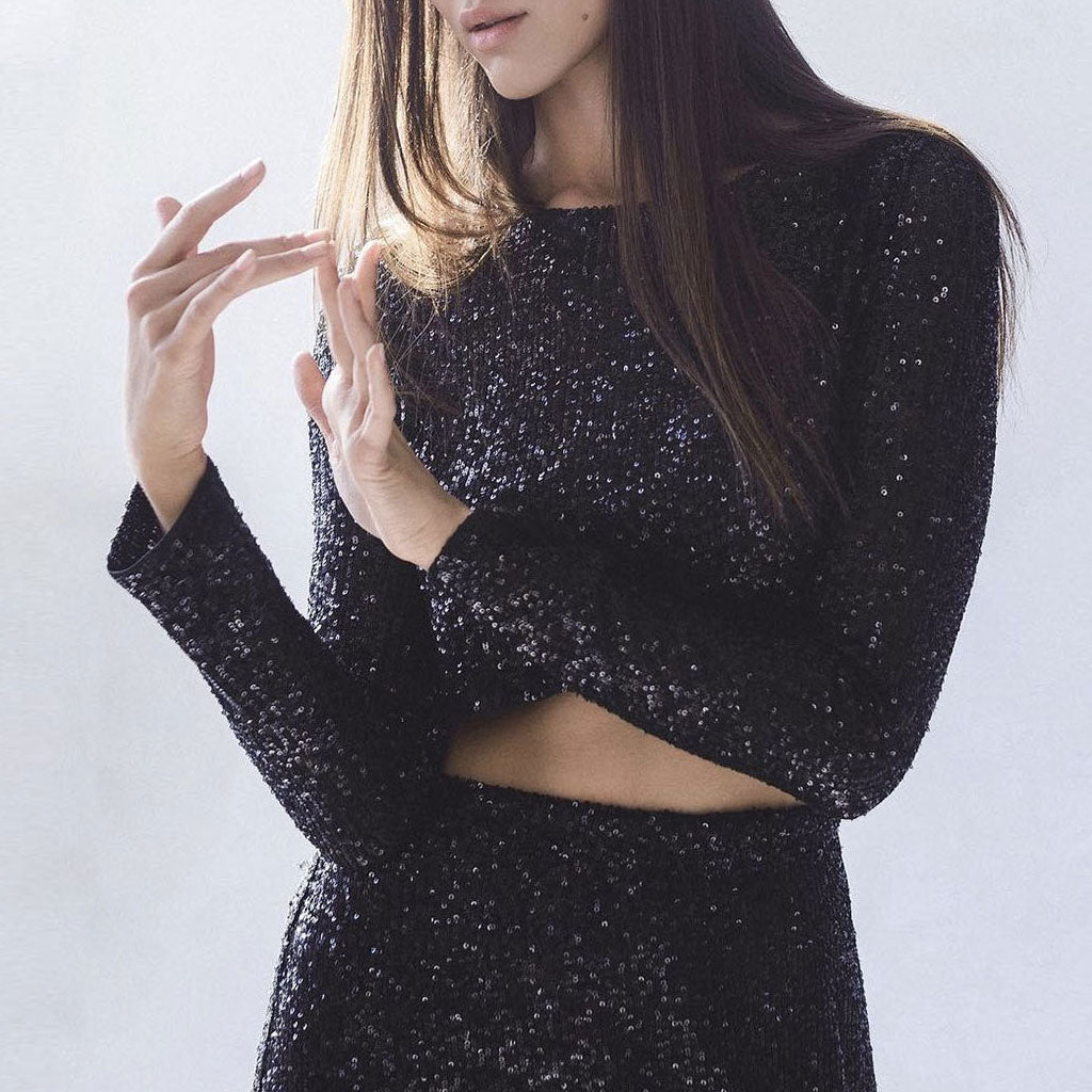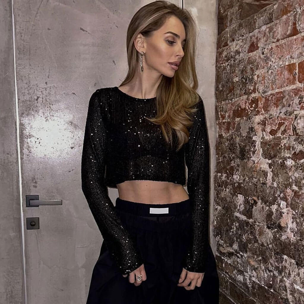 Be the Star of every day with our designer sequin top. This shimmering embellished cropped top is the epitome of contemporary glam. Available in Silver. Black. and Champagne. it's designed to captivate. With no lining and a semi-sheer finish. this pullover top offers both stretchy comfort and a perfect fit. This long-sleeve top isn't just an addition to your wardrobe; it's a statement of confidence and individuality. Pair it with our sequin skirt. and you're an absolute ten.