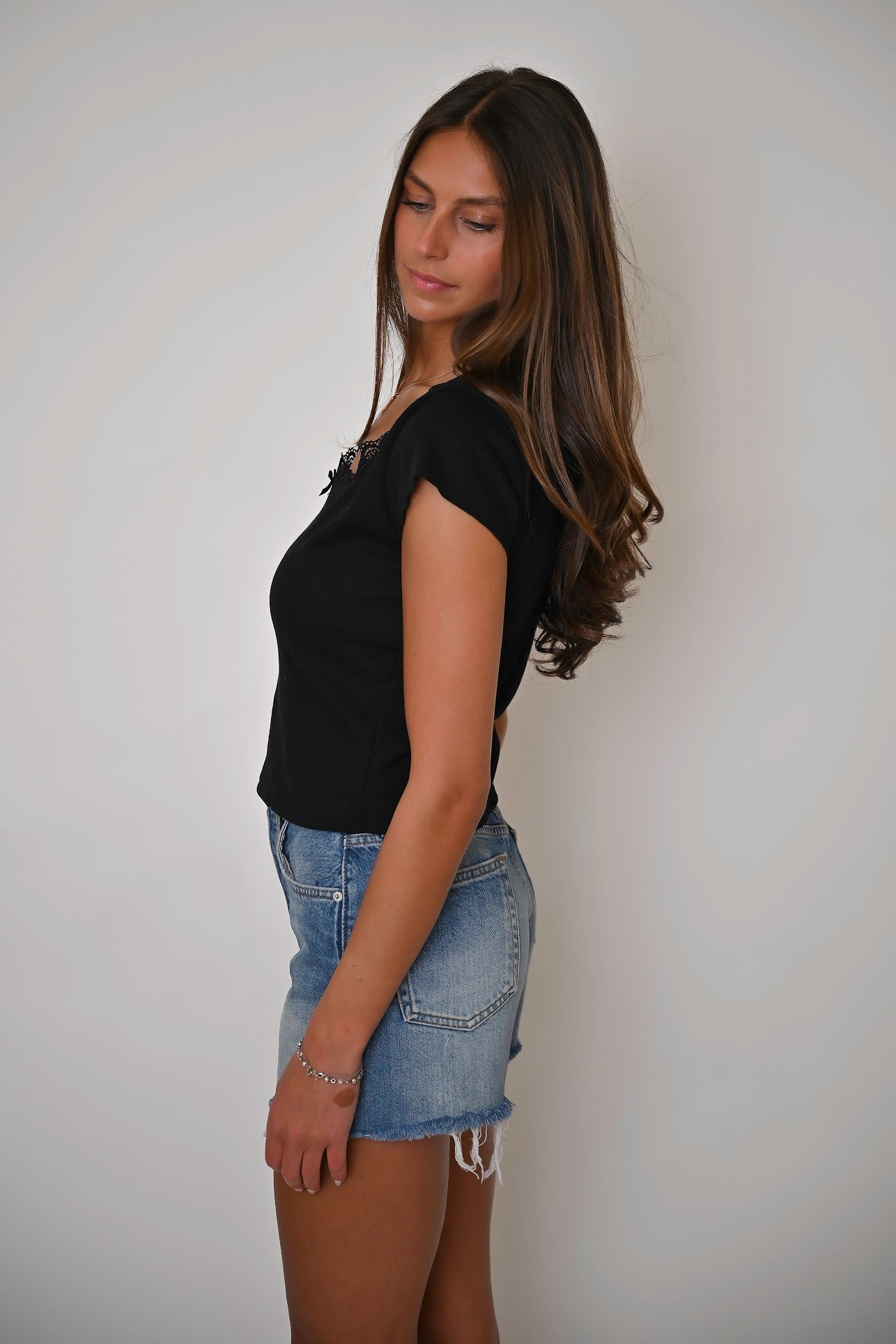 Add feminine flair with our Stocking Top, now available in pink, white, and black. This snug-fitting, ribbed top features sweet lace trim and a delicate bow detail at the neckline, combining comfort with romance. Perfectly blending playful and practical elements, it's ideal for any occasion.