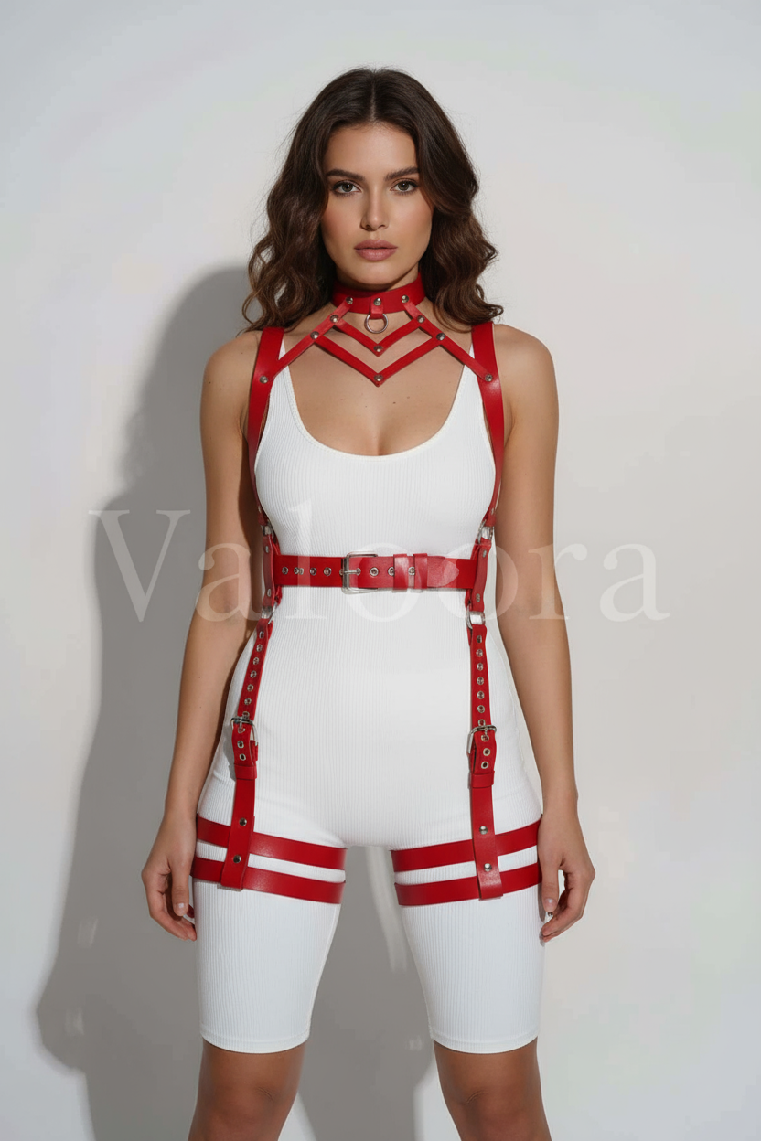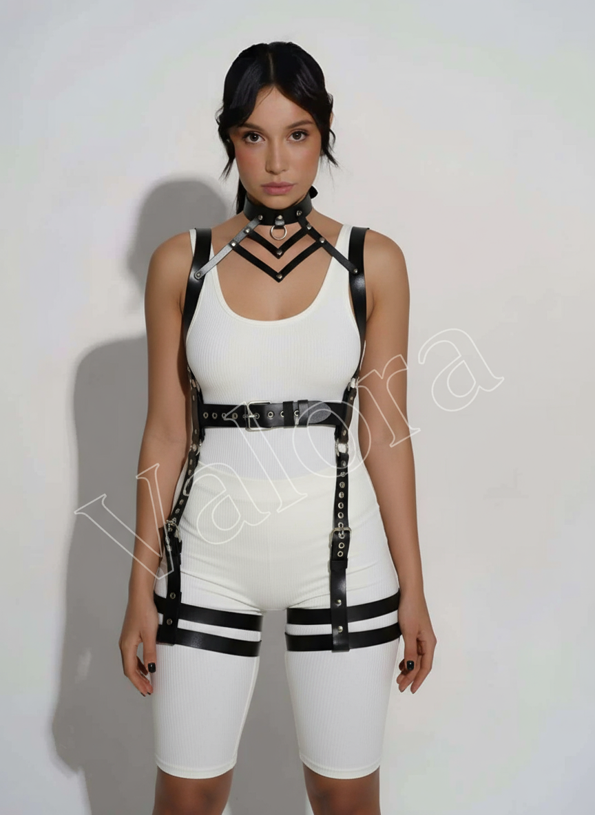 Command attention in this striking leather body harness designed with bold straps, a choker neckline, and a cinched waist belt for a structured, sensual silhouette. Its powerful lines accentuate the body while offering an adjustable fit for both comfort and allure. Perfect for transforming any look into an unforgettable fantasy statement.