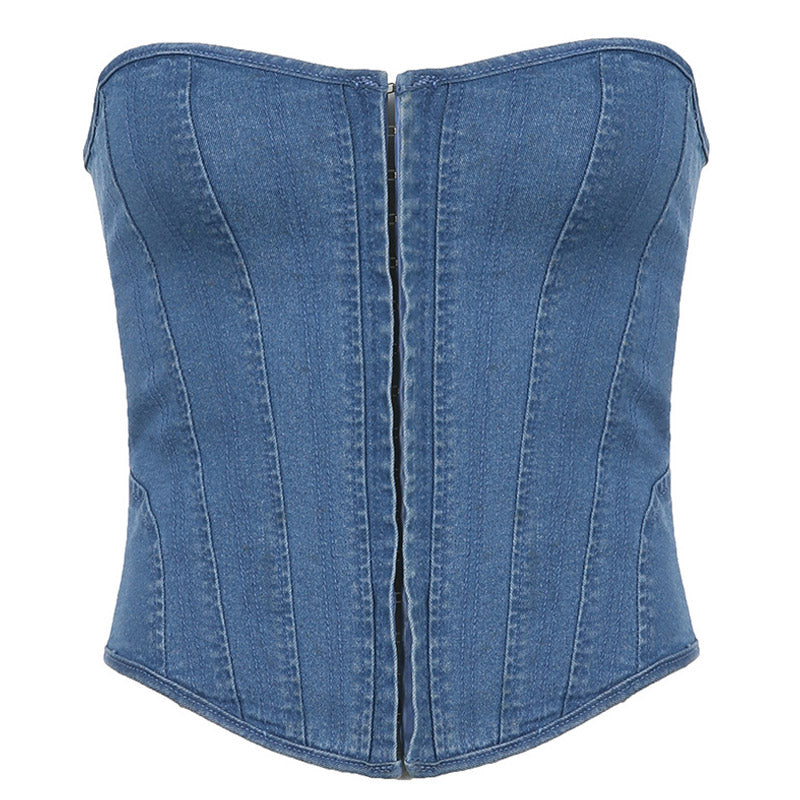 Sweetheart Neck Hook and Eye Lace Up Back Denim Tube Top - Blue