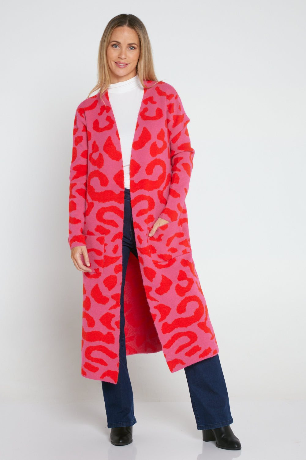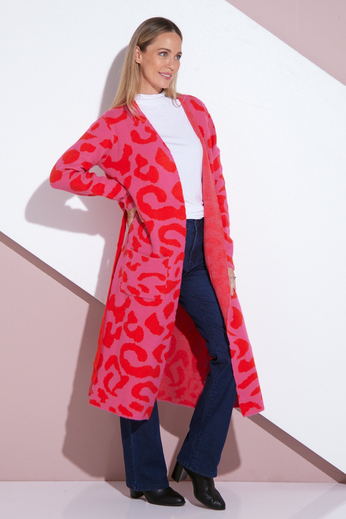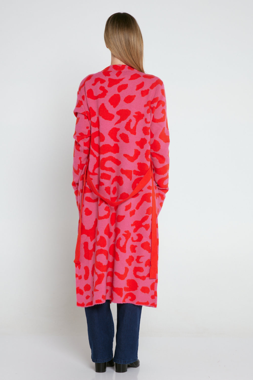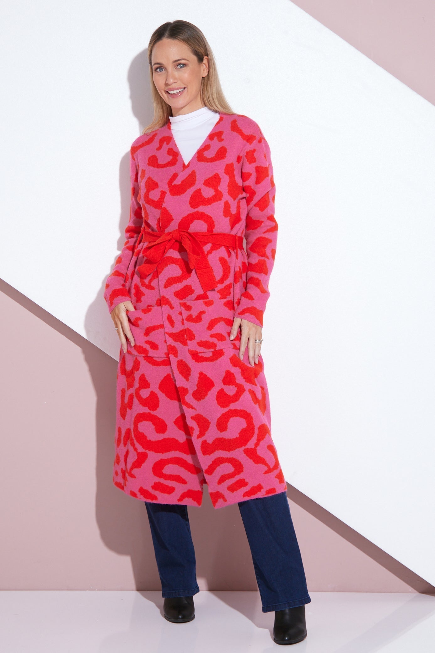 Swift Wraparound Oversized Tie Waist Cardigan - Pink/Red Cheetah Print