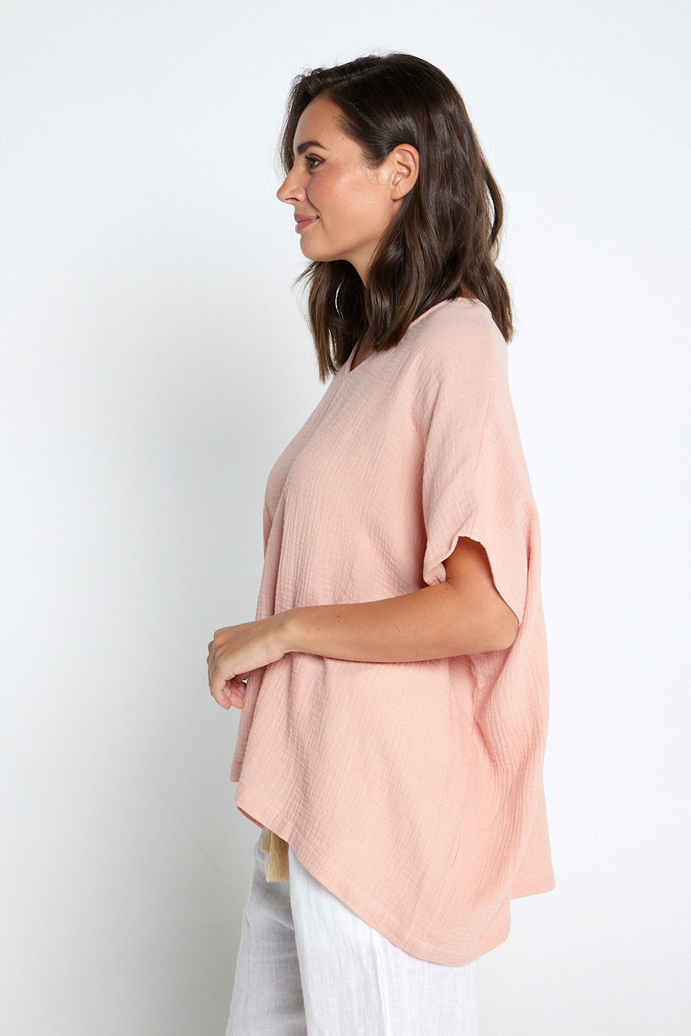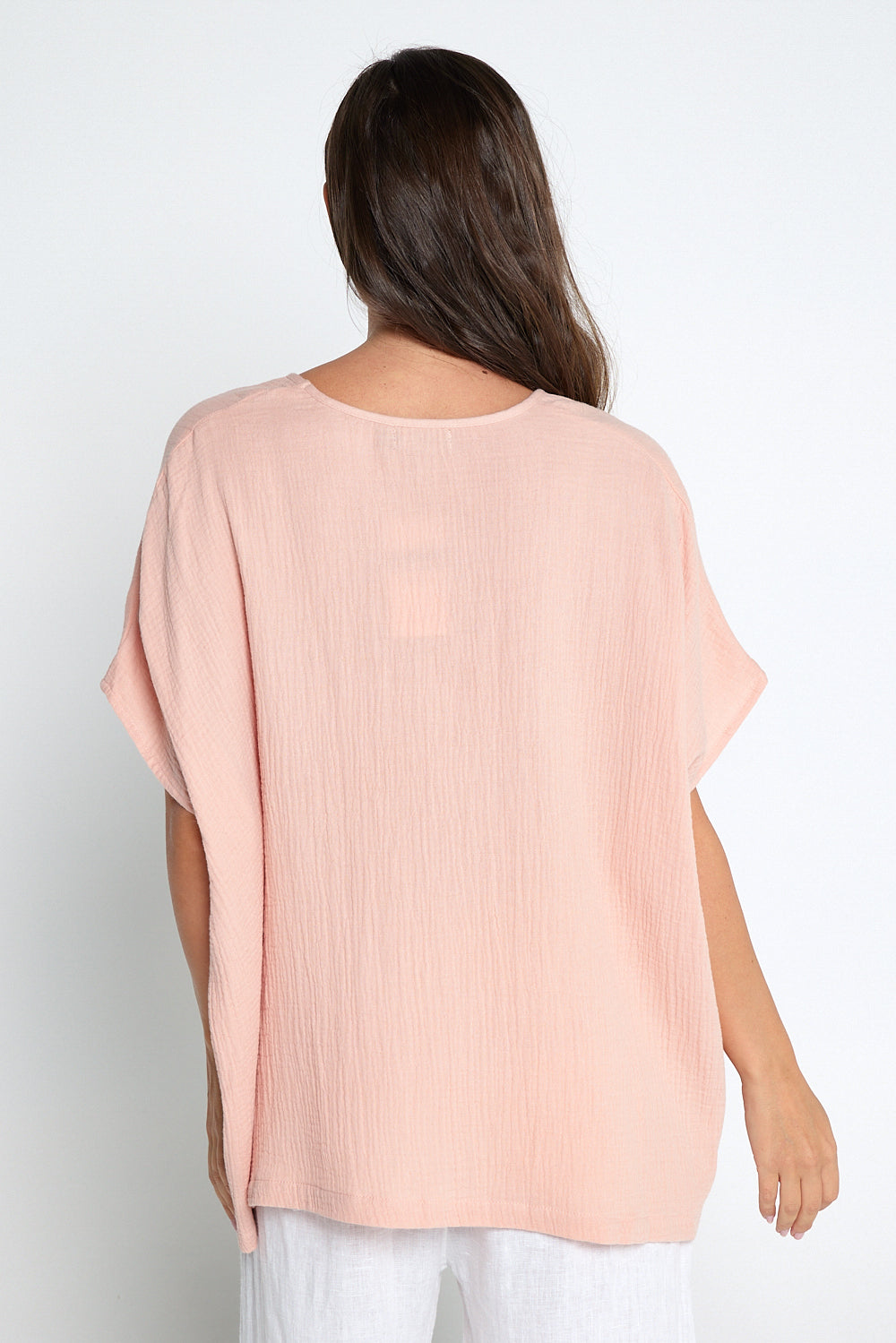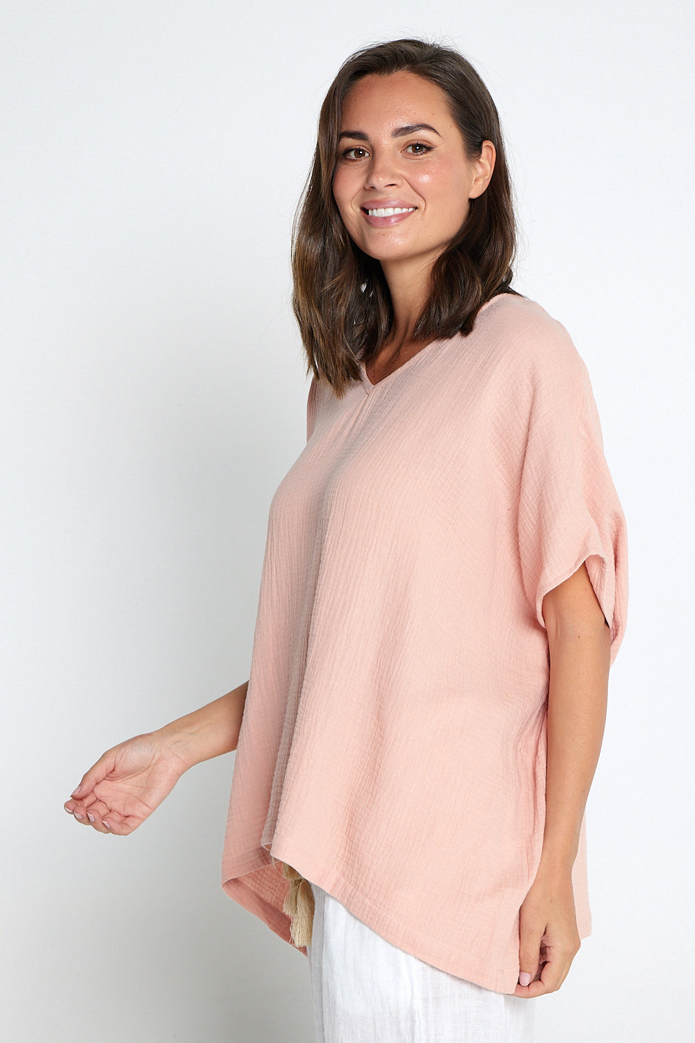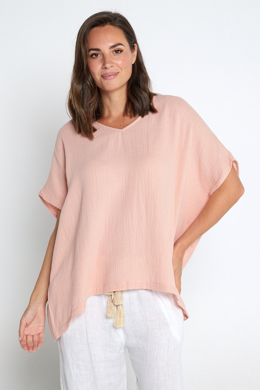 Introducing the Tahiti Muslin Top in a delightful peach hue—a must-have piece that effortlessly combines comfort with chic style. Its simplicity is elevated by a graceful V-neck, lending an air of timeless elegance to your ensemble. The extended short sleeves add a contemporary touch to this classic design, while the longer sides not only enhance the relaxed fit but also create a fluid silhouette, suitable for various body types.