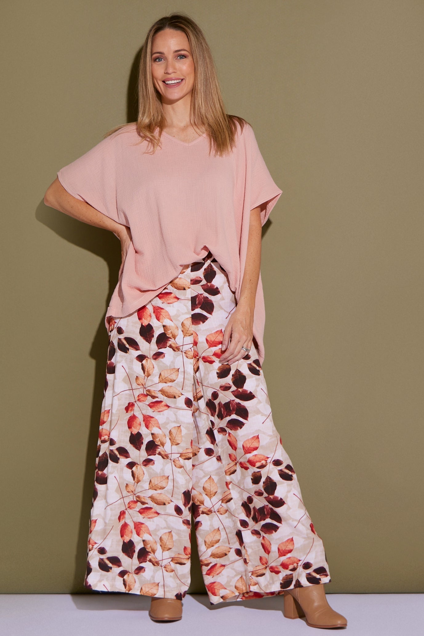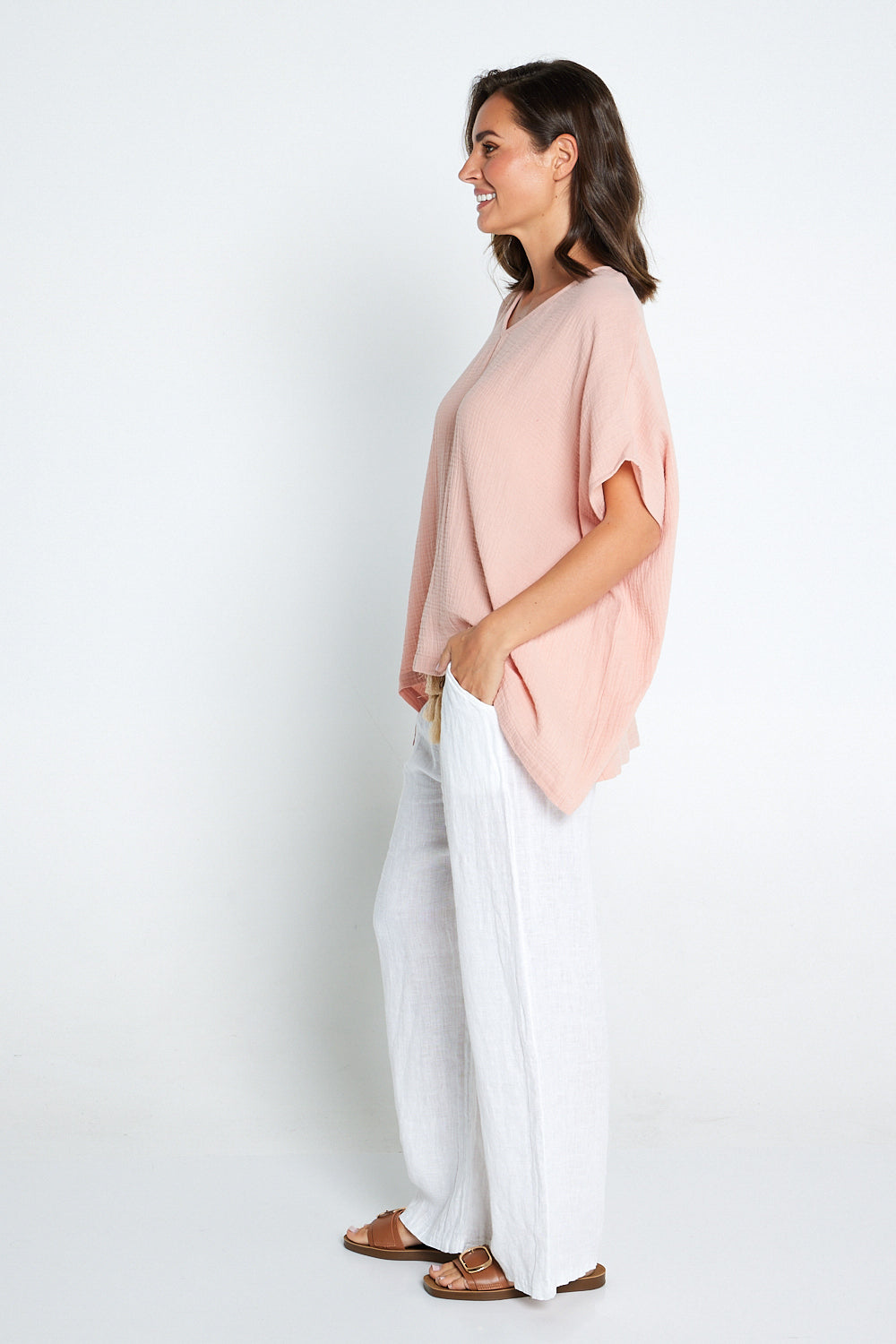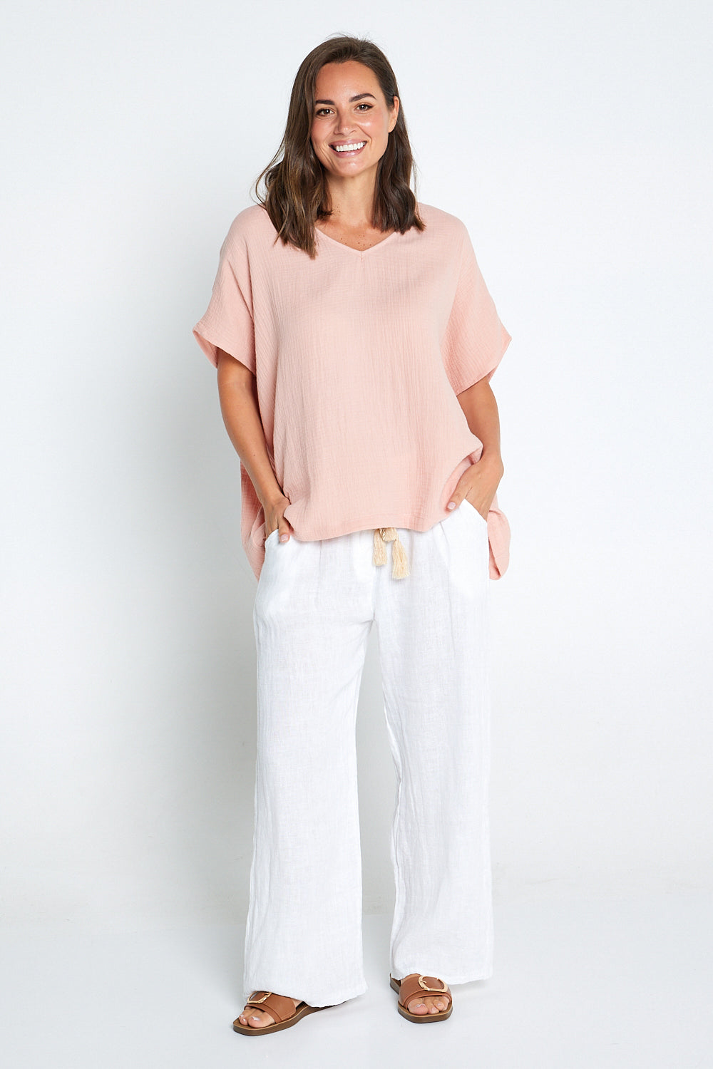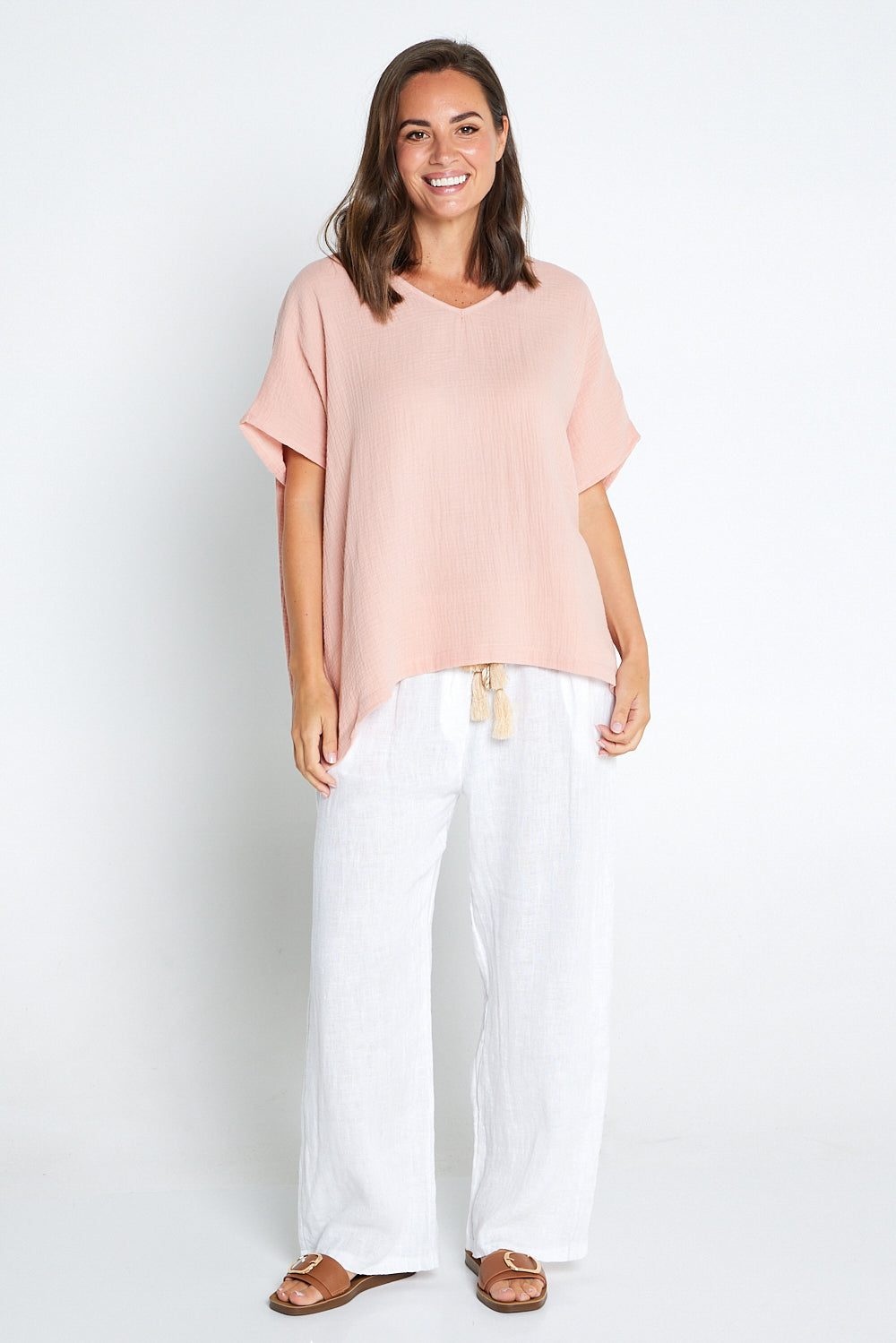 Introducing the Tahiti Muslin Top in a delightful peach hue—a must-have piece that effortlessly combines comfort with chic style. Its simplicity is elevated by a graceful V-neck, lending an air of timeless elegance to your ensemble. The extended short sleeves add a contemporary touch to this classic design, while the longer sides not only enhance the relaxed fit but also create a fluid silhouette, suitable for various body types.