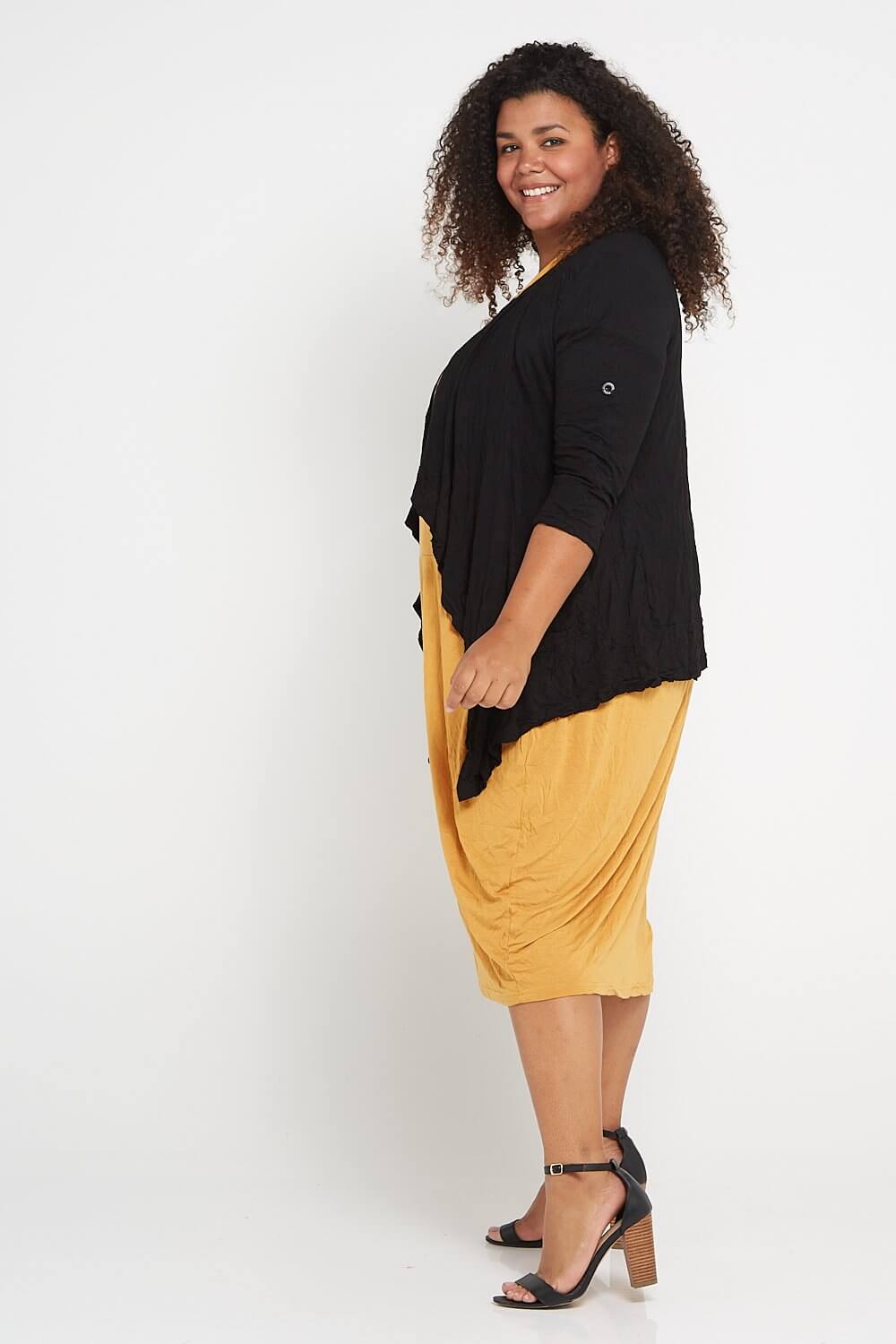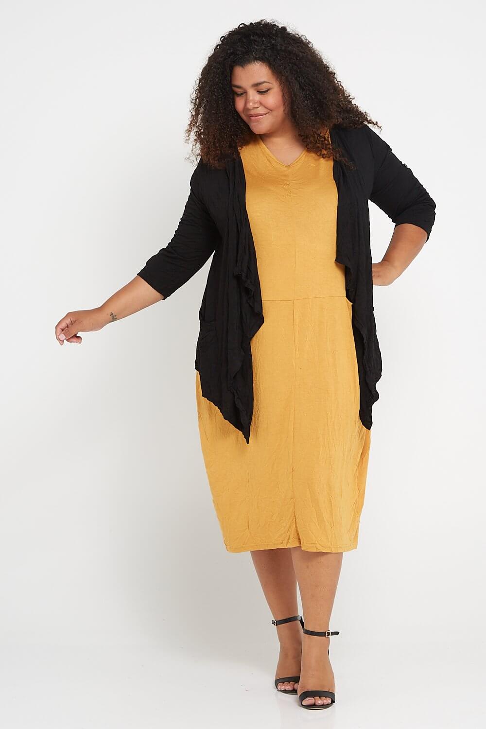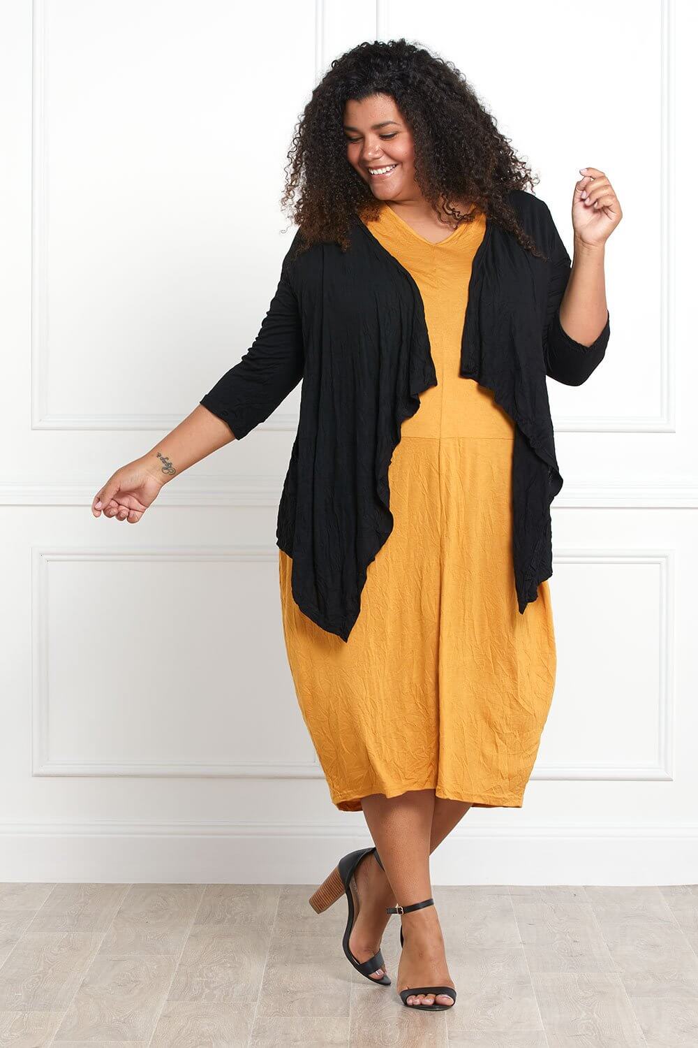 The gorgeous Teegan Crush Cardigan is perfect in classic black. The 100% cotton jersey jacket is breathable in warm weather, and cosy for layering during the cooler months. The lightly crushed cotton fabric is great to roll up in your bag for travelling and acts as the ideal insurance against unpredictable weather! Cut with a waterfall lapel, side pockets, and sleeves that you can roll up and fastened with a button tab. You'll get so wear this beautiful style year round! So easy to style with your favourite tops and dresses.