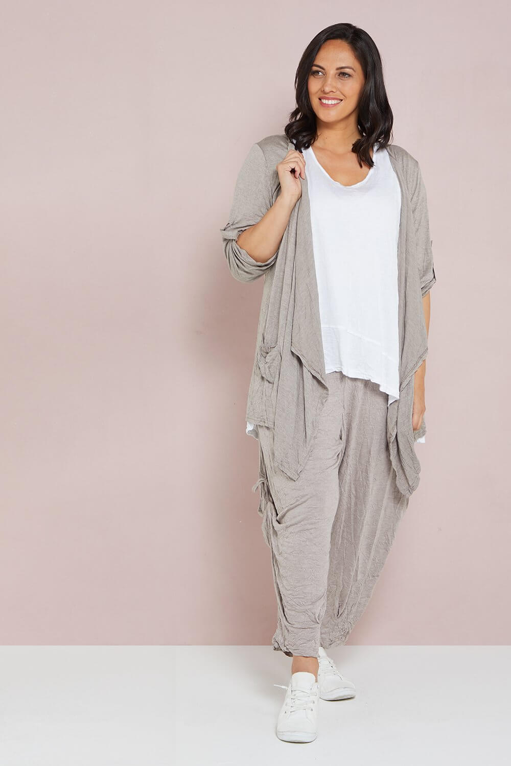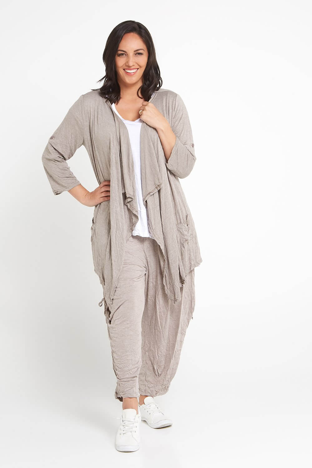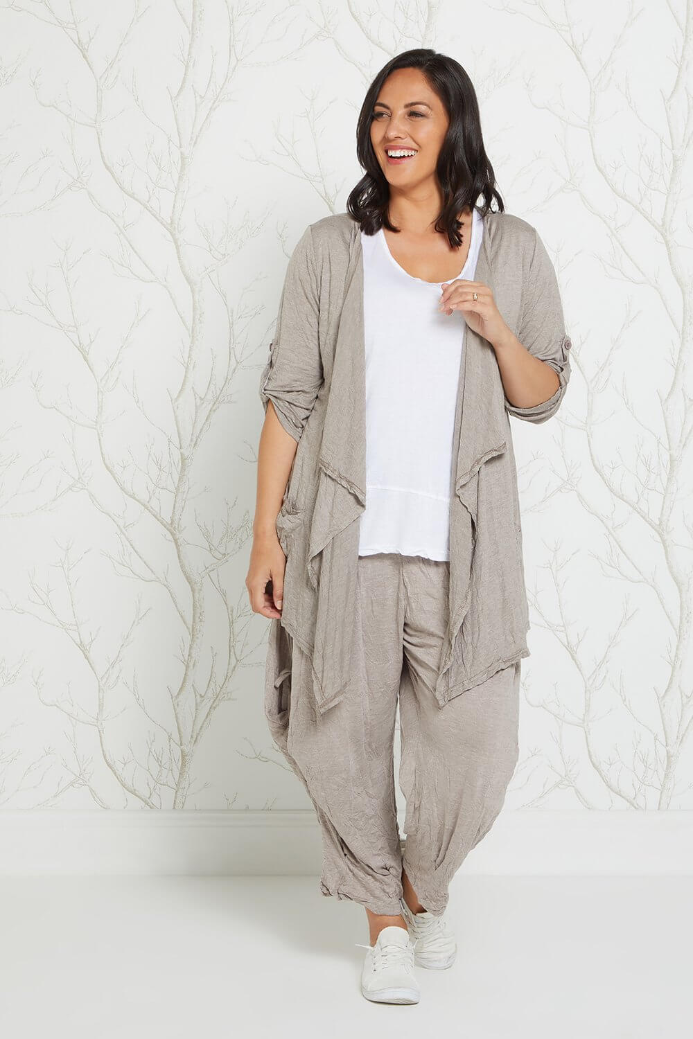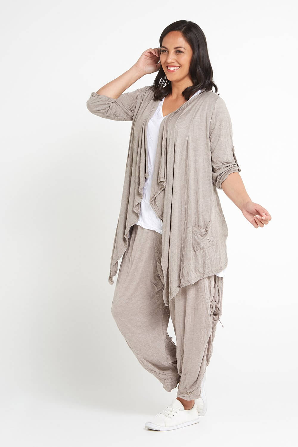The gorgeous Teegan Crush Cardigan now comes in spelt, the loveliest light brown beige. The 100% cotton jersey jacket is breathable in warm weather, and cosy for layering during the cooler months. The lightly crushed cotton fabric is great to roll up in your bag for travelling and acts as the ideal insurance against unpredictable weather! Cut with a waterfall lapel, side pockets, and sleeves that you can roll up and fastened with a button tab. You'll get so wear this beautiful style year round! So easy to style with your favourite tops and dresses.