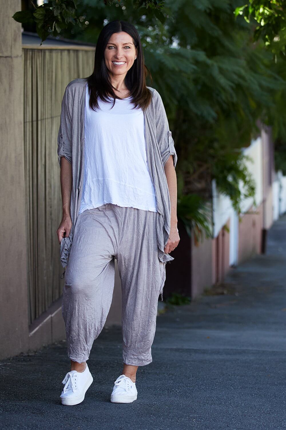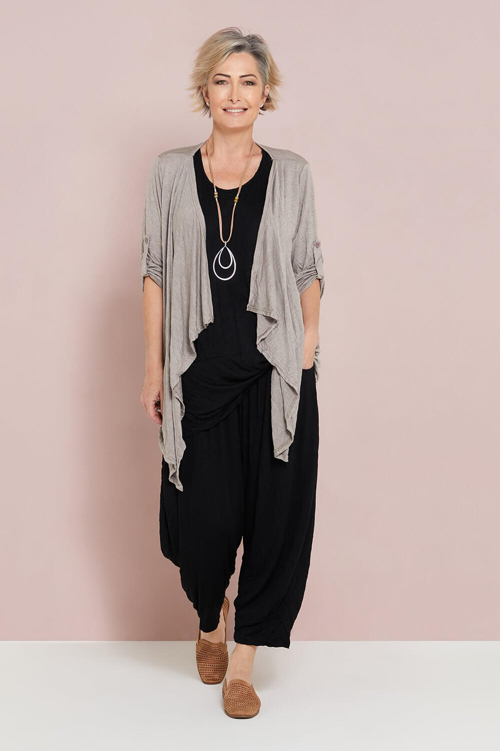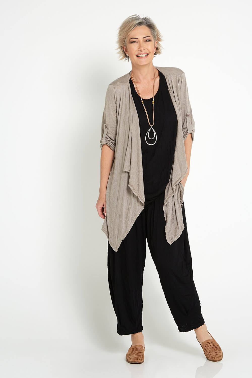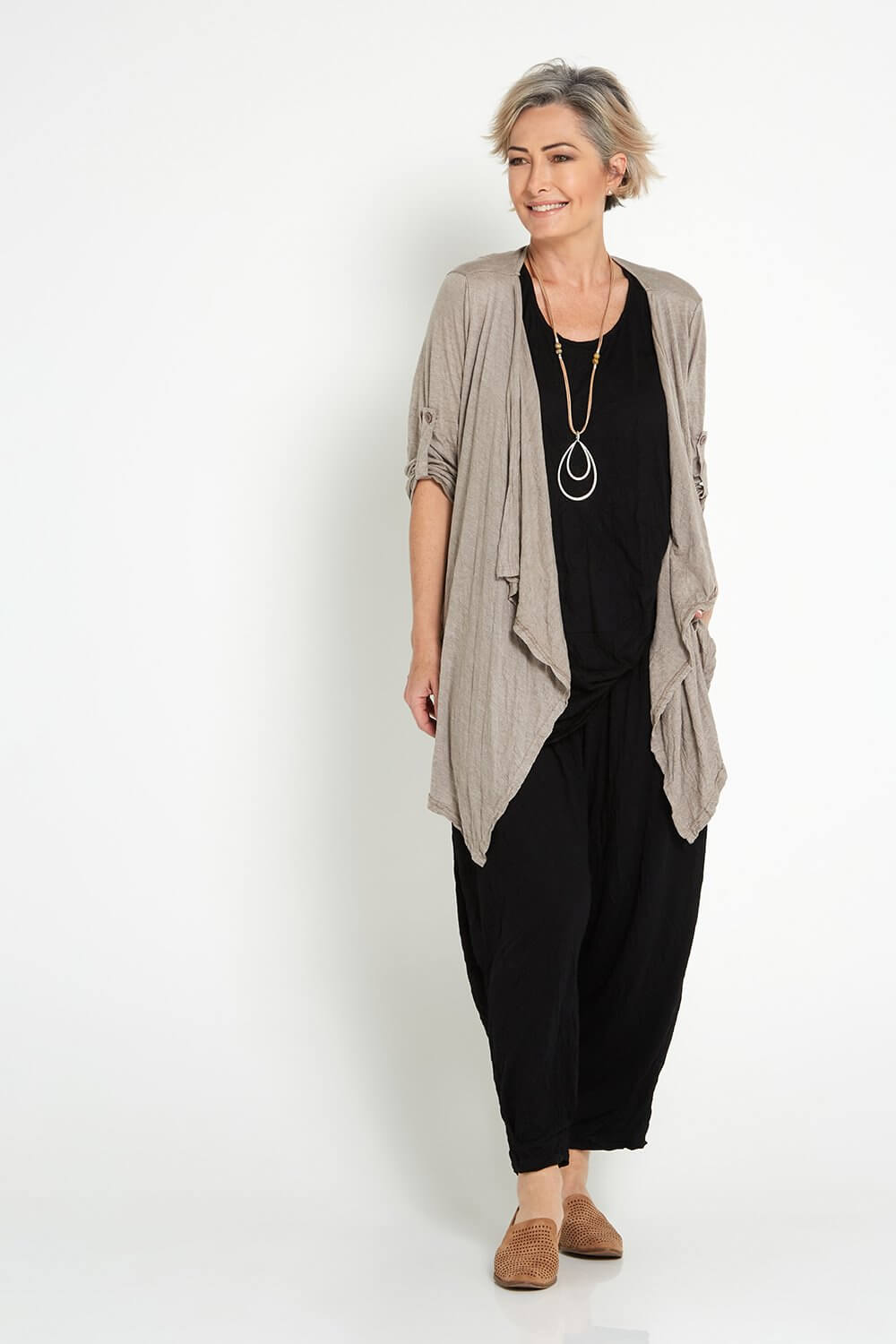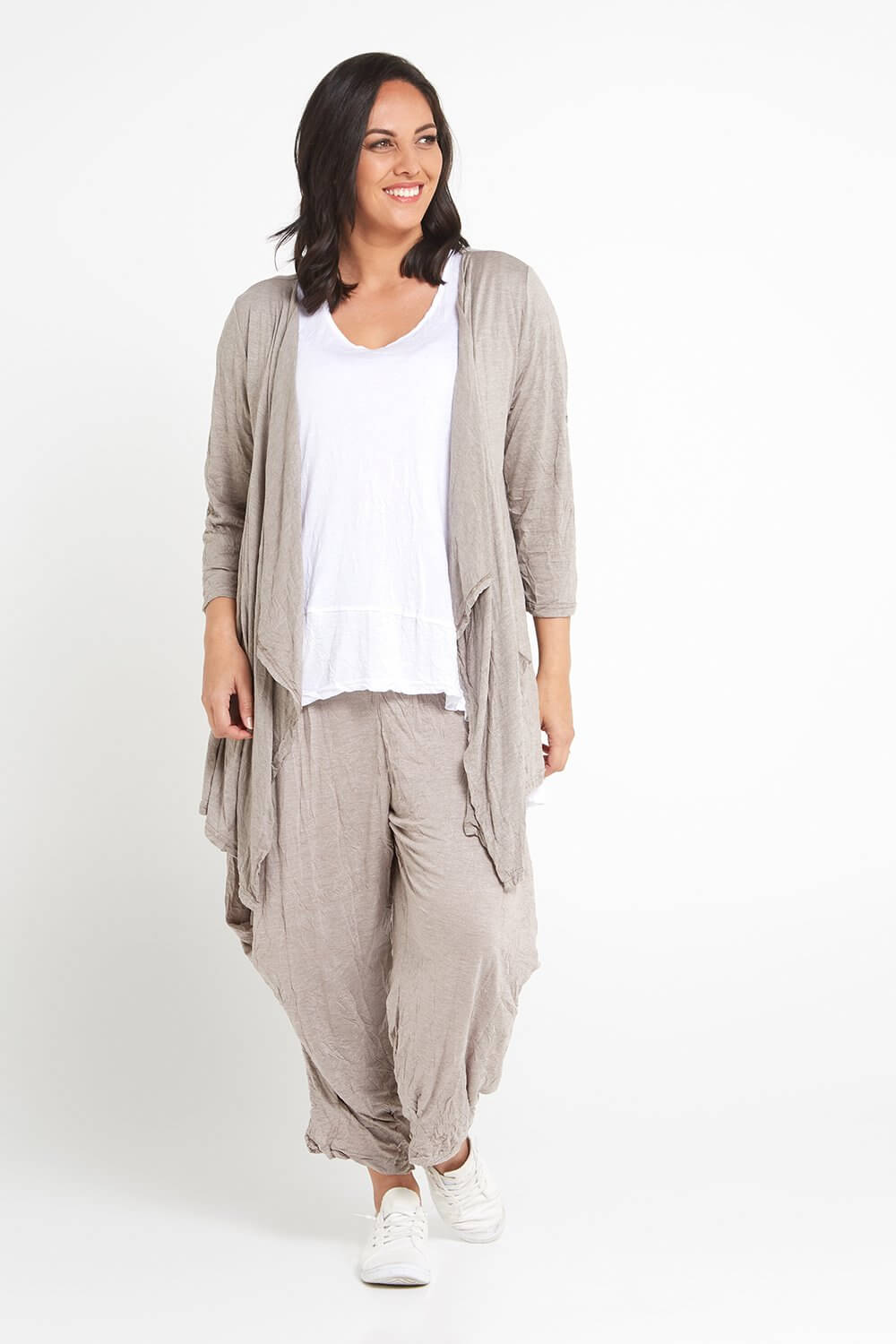 The gorgeous Teegan Crush Cardigan now comes in spelt, the loveliest light brown beige. The 100% cotton jersey jacket is breathable in warm weather, and cosy for layering during the cooler months. The lightly crushed cotton fabric is great to roll up in your bag for travelling and acts as the ideal insurance against unpredictable weather! Cut with a waterfall lapel, side pockets, and sleeves that you can roll up and fastened with a button tab. You'll get so wear this beautiful style year round! So easy to style with your favourite tops and dresses.