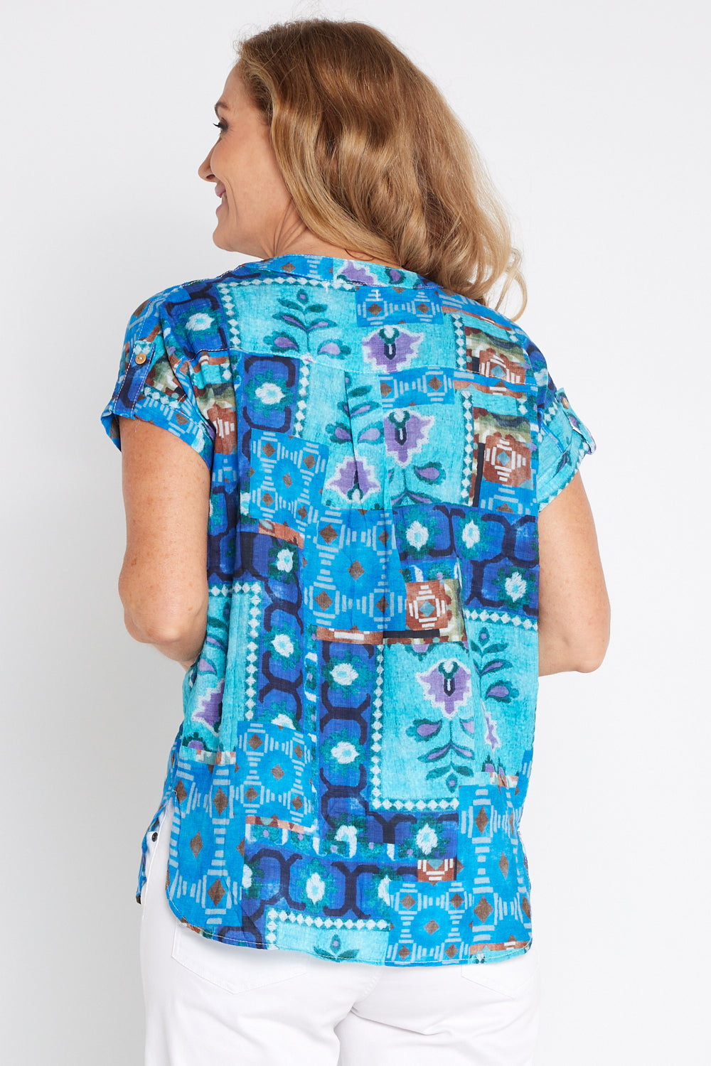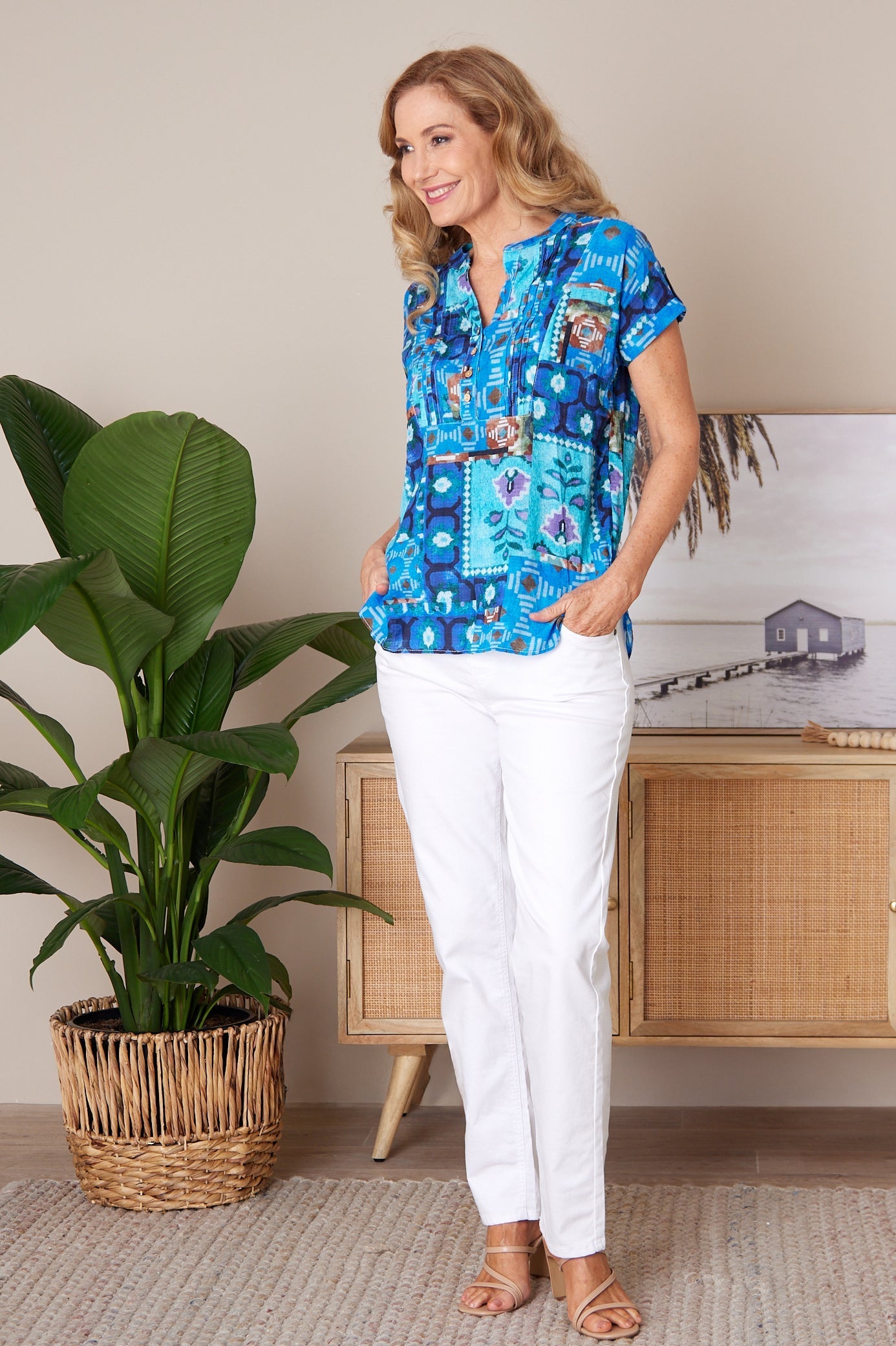 The Tessa Top - Blue Collage combines vibrant colours and artistic patterns to create a bold statement piece. This versatile top is perfect for adding a touch of creativity to your wardrobe, whether styled casually or dressed up for a fun day out.