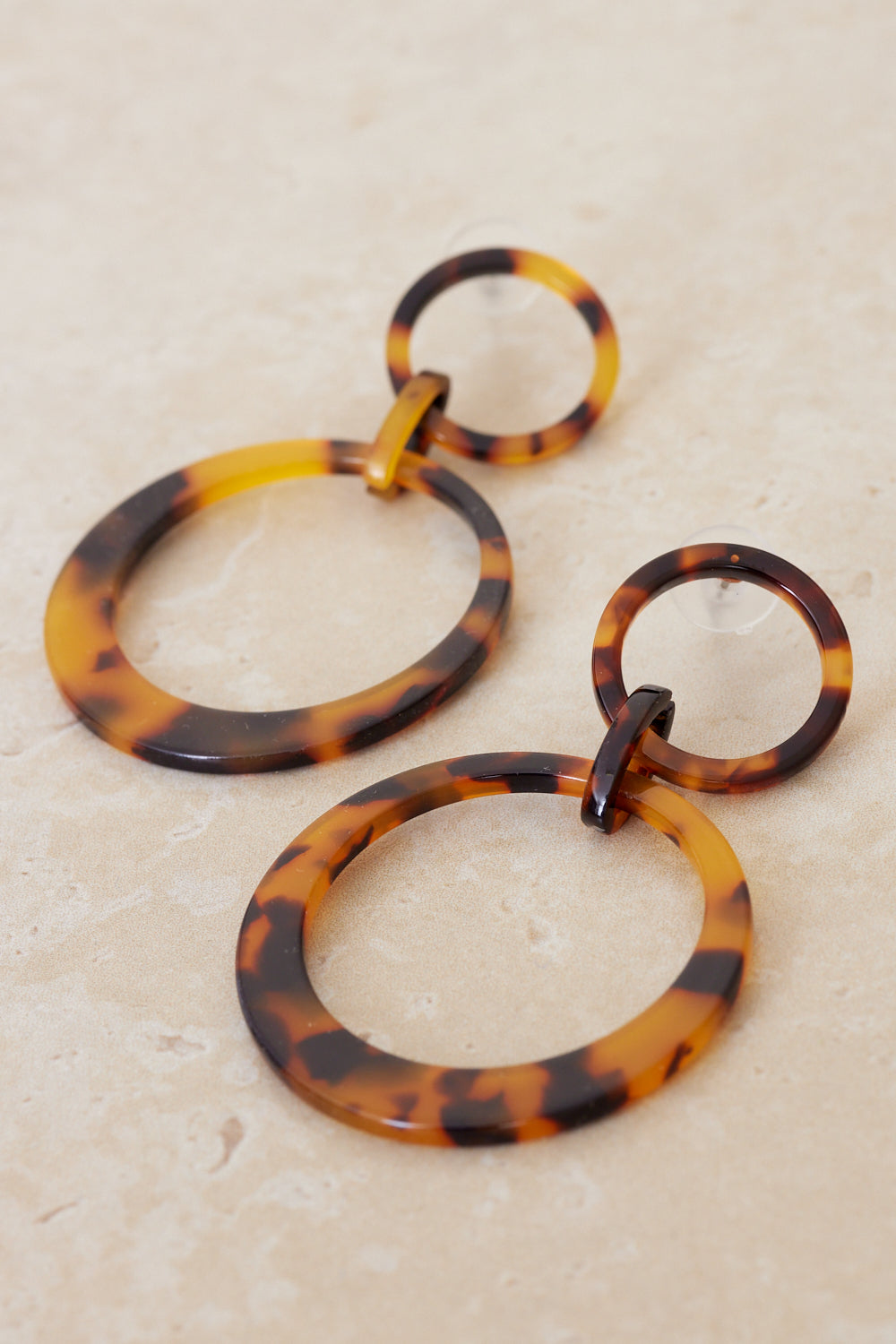 Add a touch of elegance to your look with the Tortoiseshell Link Earrings in brown. These earrings feature interlocking circular links with a classic tortoiseshell pattern, offering a sophisticated and timeless design. Perfect for both casual and formal occasions, their lightweight construction ensures comfort throughout the day. These earrings are a versatile addition to any jewellery collection, enhancing your style with their unique and chic appearance.