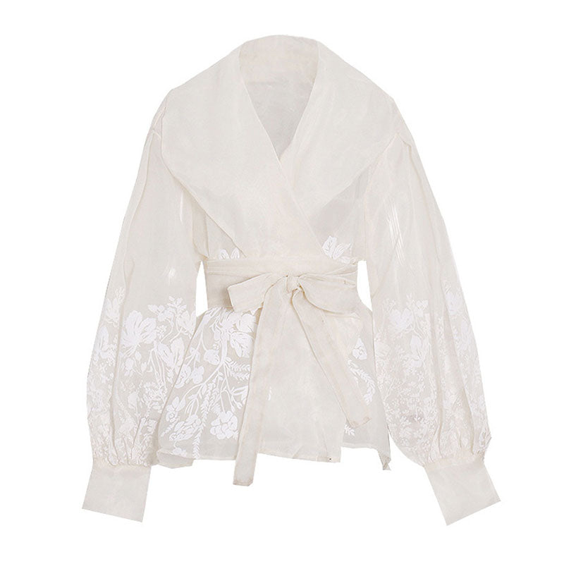 Transparent Shawl Collar Tie Belt Lantern Sleeve Floral Organza Blouse