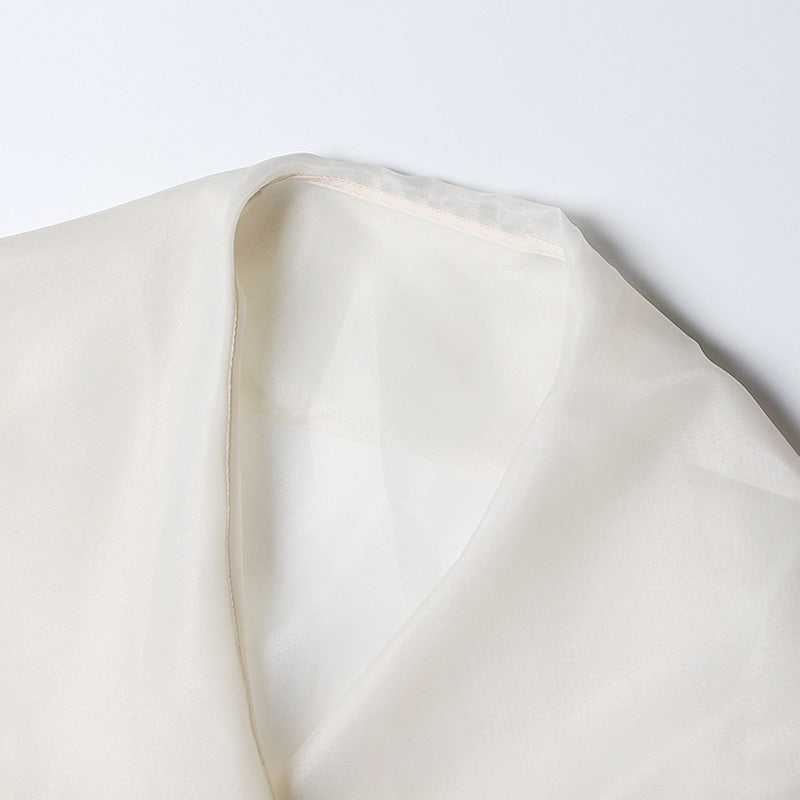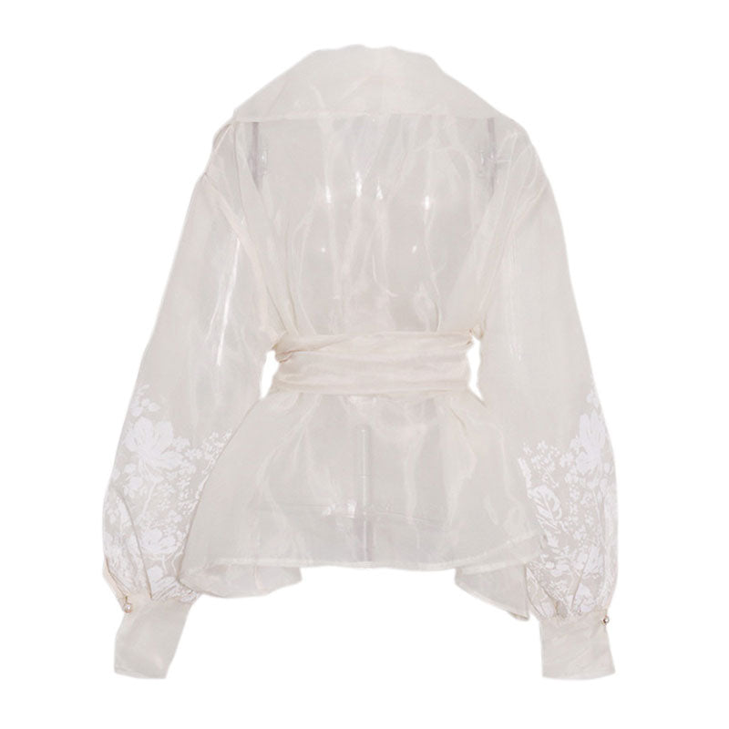 Add a touch of delicate beauty and refinement to any outfit with our sheer organza jacket. The subtle floral design effortlessly exudes grace. while the oversized fold-over collar and lantern sleeves create a gentle. flowing silhouette. Accentuate your waist with the tie-belt. creating a flattering hourglass figure. The unlined construction offers a transparent quality. adding to its allure and sophistication. Whether it's for a romantic dinner or a day at the office. this designer blouse is a must-have addition to your wardrobe.