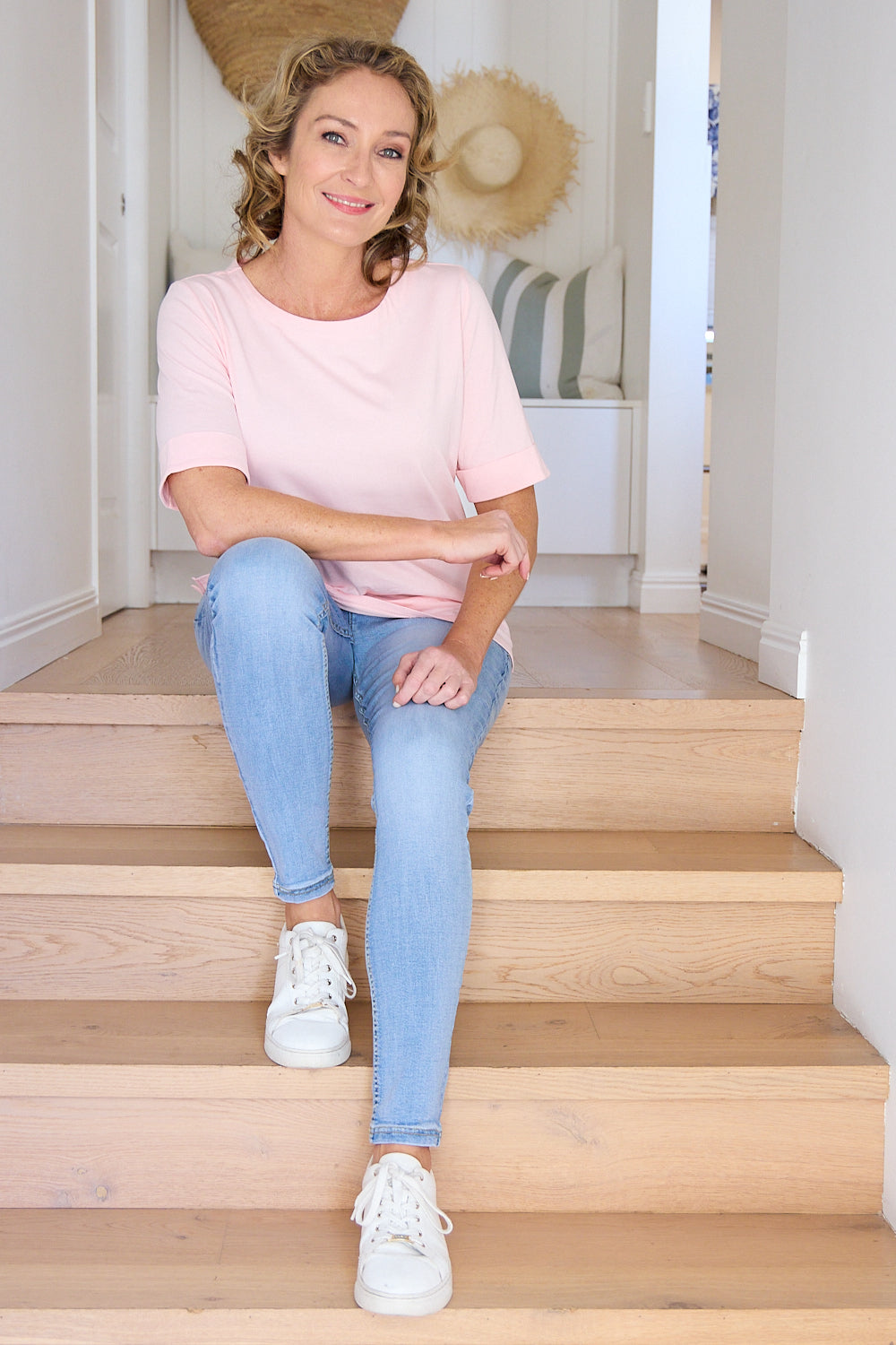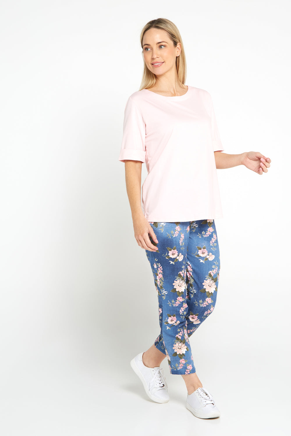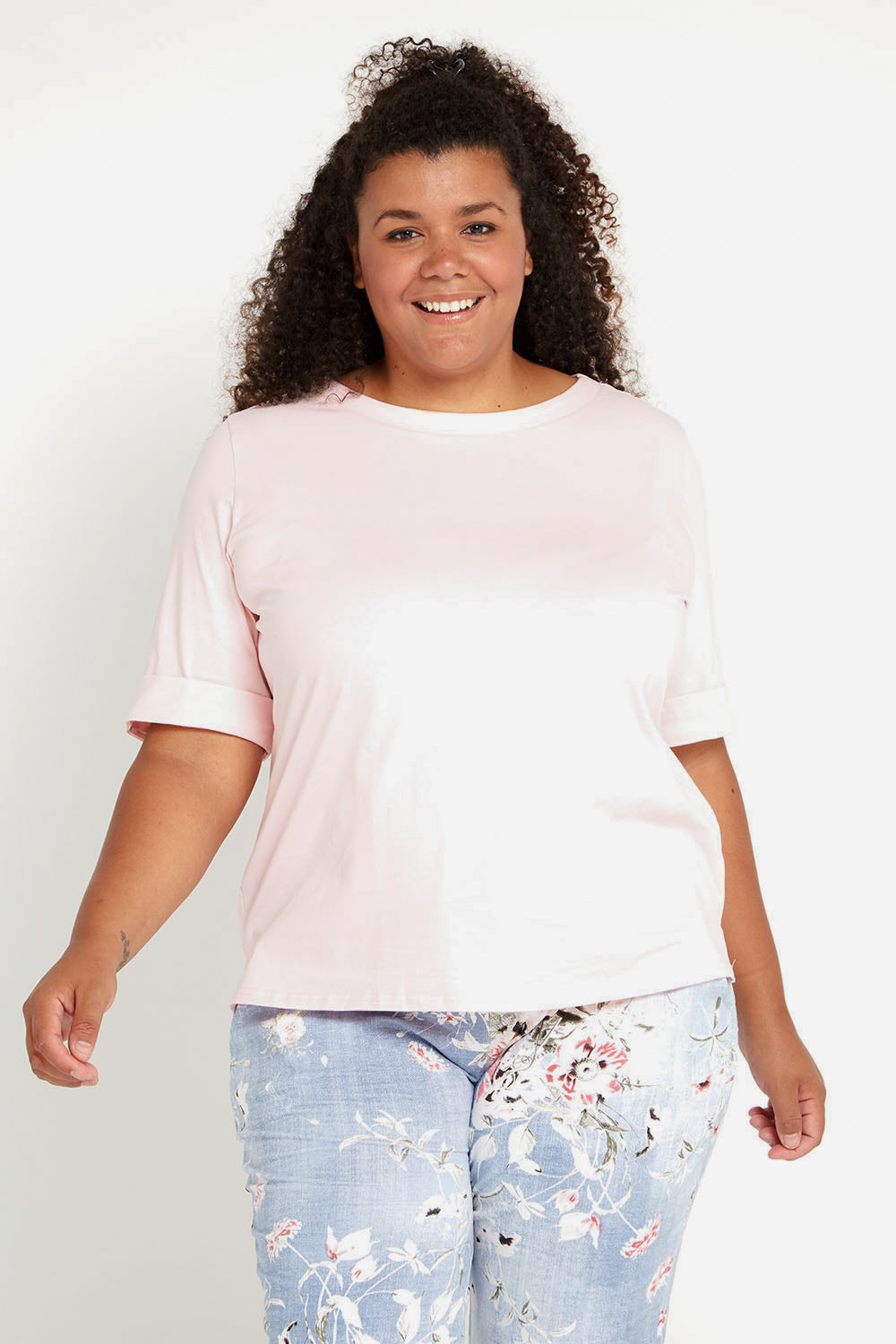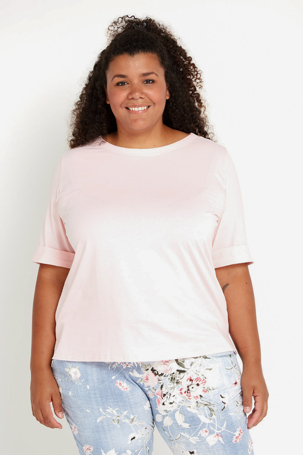 There's nothing more essential to a wardrobe than a comfortable t-shirt that fits just right. We love the clever cut of this one, with sleeves that offer a bit extra coverage on the upper arm and feature a flattering, wide rolled edge. The soft pink is a nice alternative to your typical neutrals, but is still super easy to style and very flattering on the skin. With a cotton rich composition with a touch of added stretch for an easy fit and to keep its shape, you just can't go wrong.