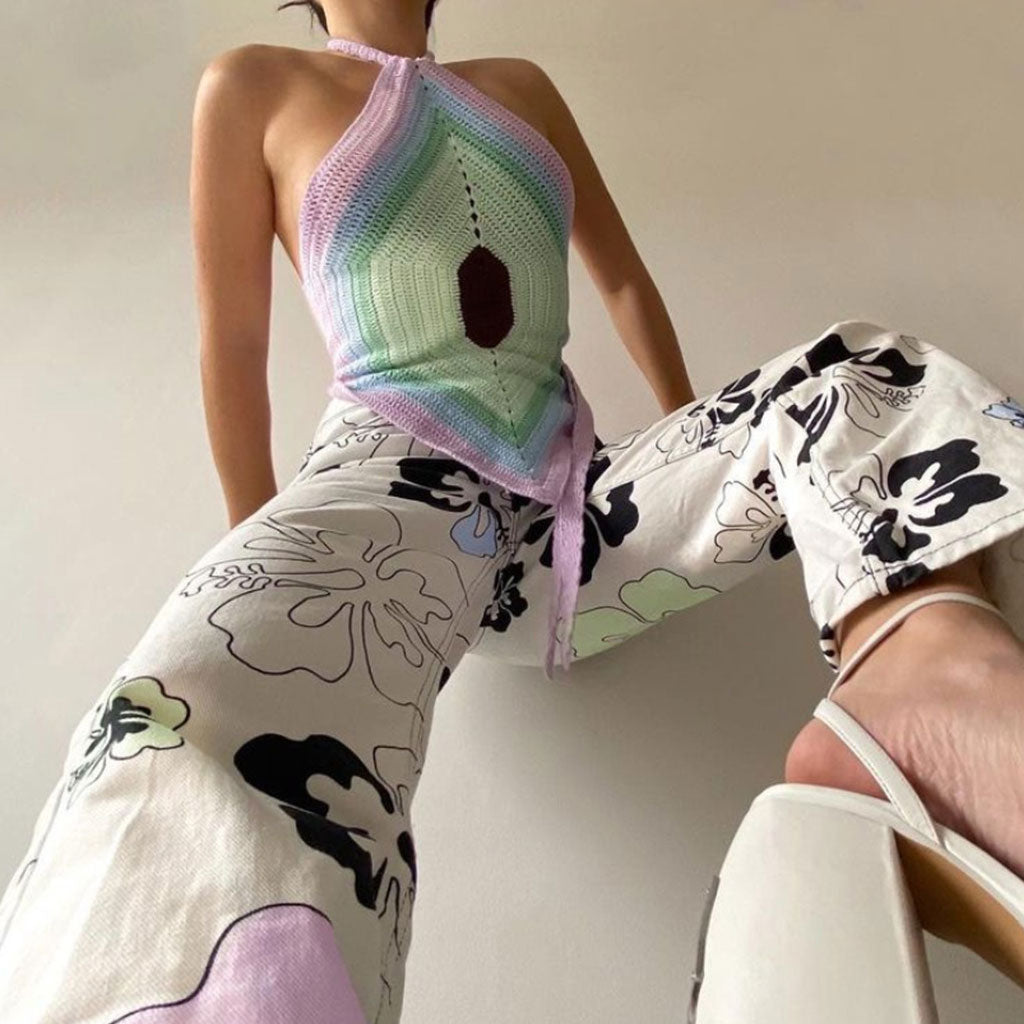 This bright-colored knit crop is perfect for strolling down a sandy beach or enjoying a new outing! Crafted with stretchy jersey and spandex. embellished with a pointelle handkerchief profile in color panel. featuring a halter neck along with a tie on the neck. a backless styling tailored with a rear tie. and ended up with an asymmetric hem. Find more unique women's knit tops or trendy clothing in our boutique. and complete it with anything-depending on the look you want.