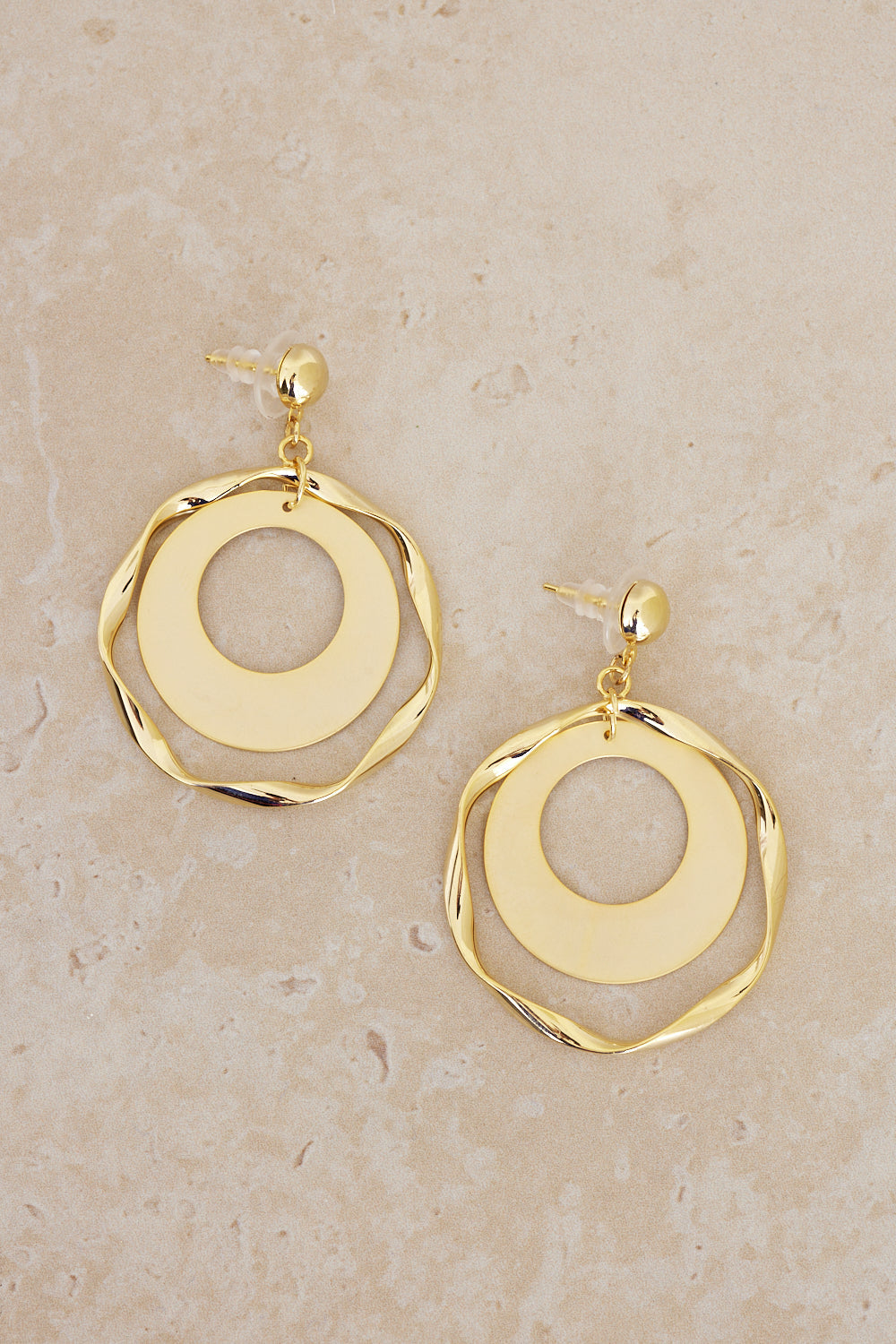 The Willow circle drop earrings in gold feature a modern double-circle design with a twisted outer layer for added texture. Lightweight and versatile, these earrings bring effortless elegance to both casual and formal outfits. A perfect statement accessory to enhance your jewellery collection.